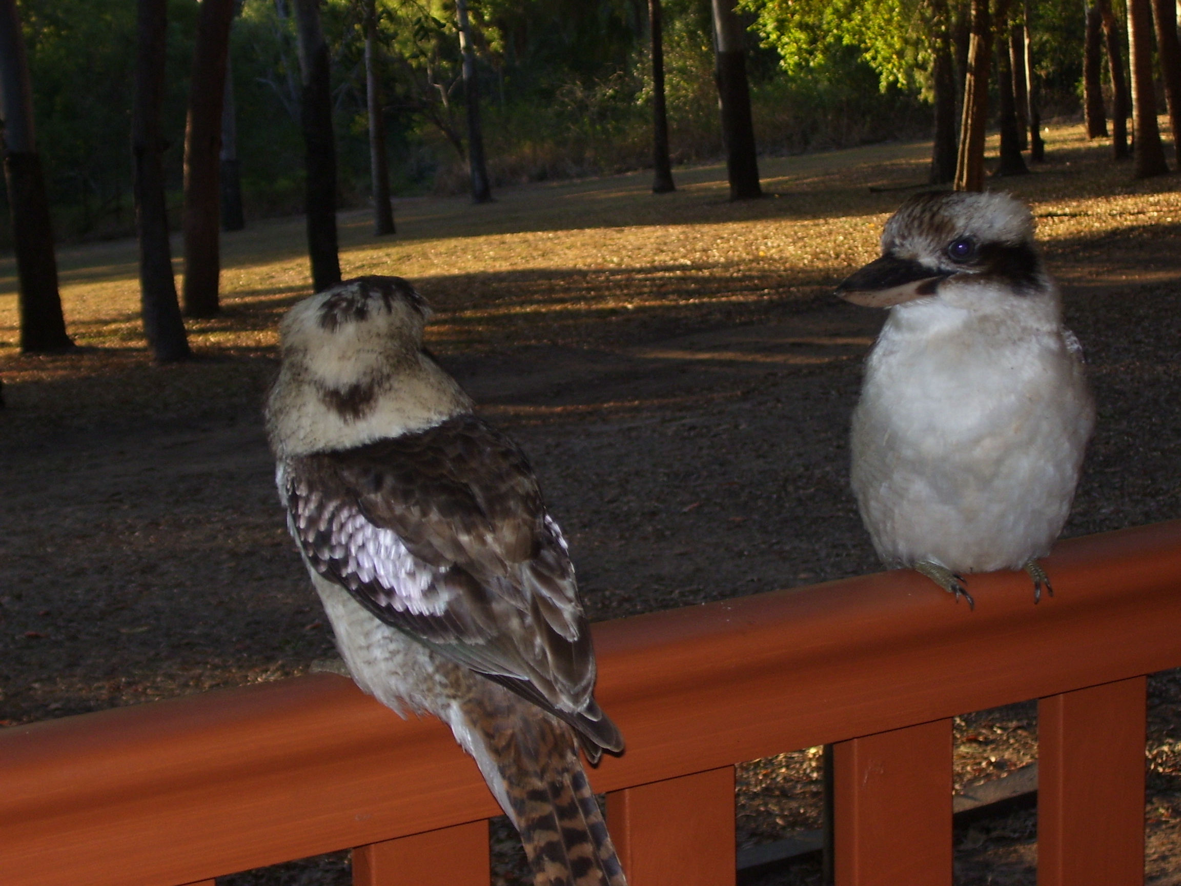 Kookaburras visiting residents of cabins at a caravan park in the hopes of getting a free meal.