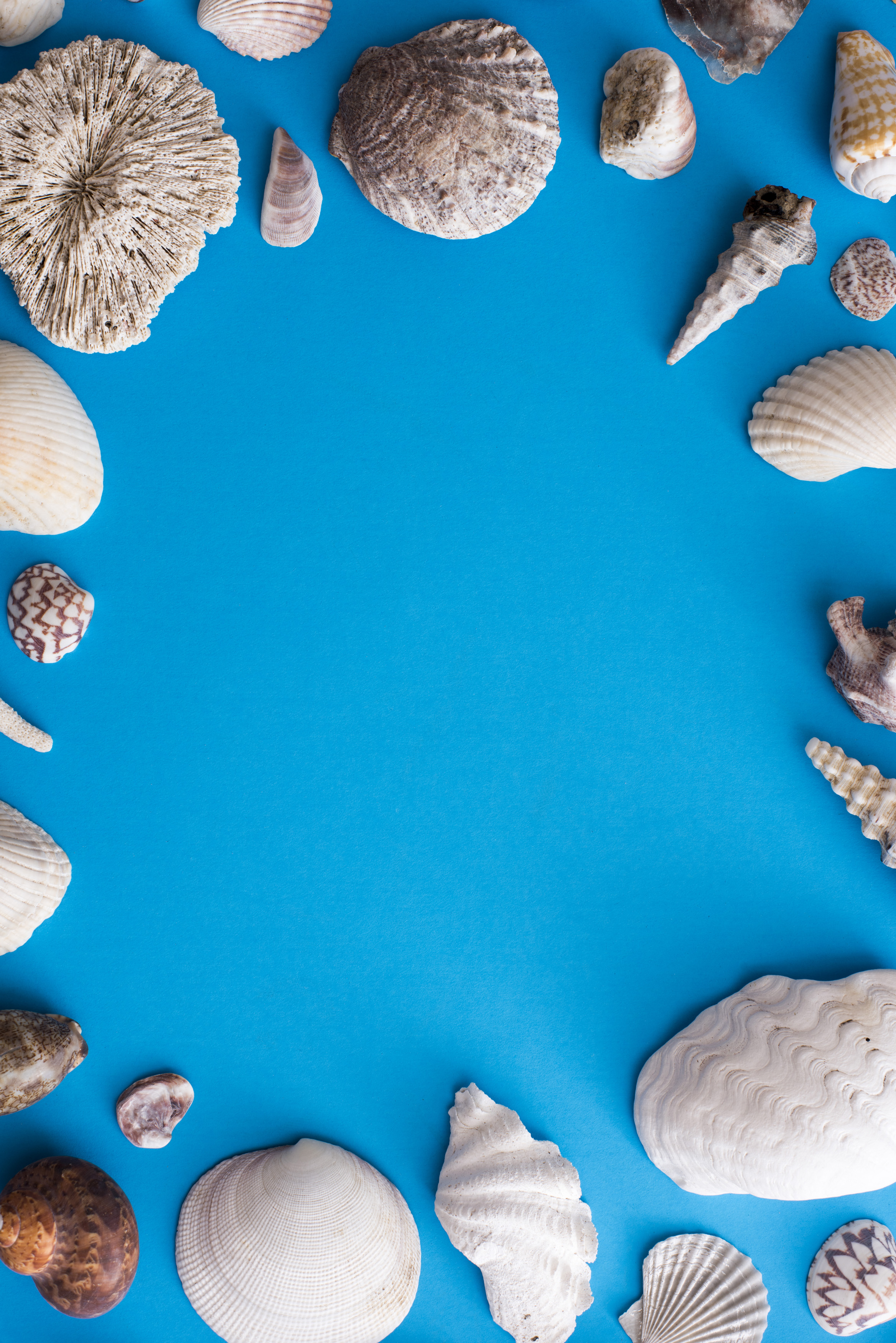 Nautical or marine themed frame of old bleached seashells and coral arranged around blue copy space viewed from above