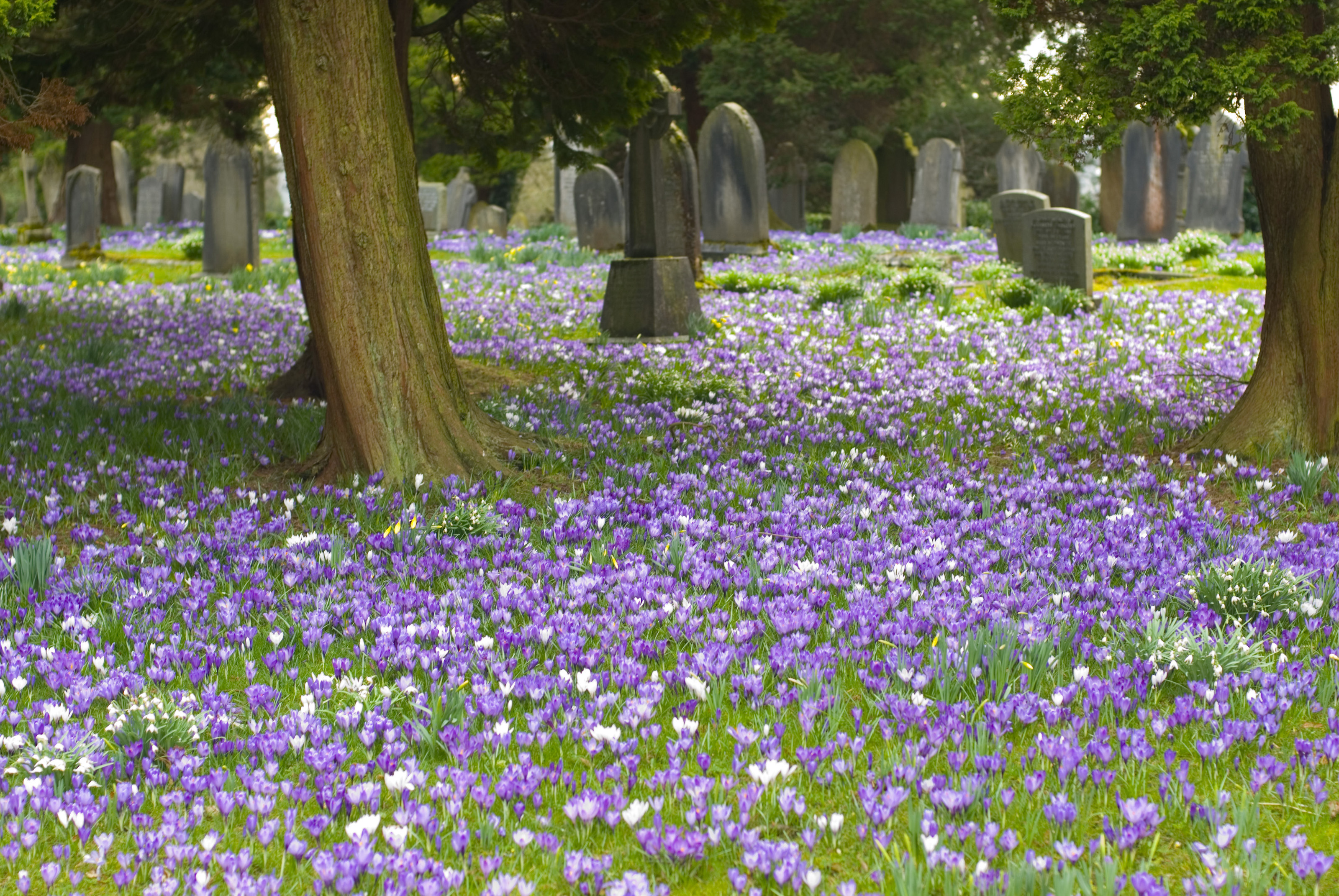 Keywords: spring, carpet, season, display, weather, purple, climate, bulbs, easter, crocus, floral, flowers, blooming, gravestones, churchyard