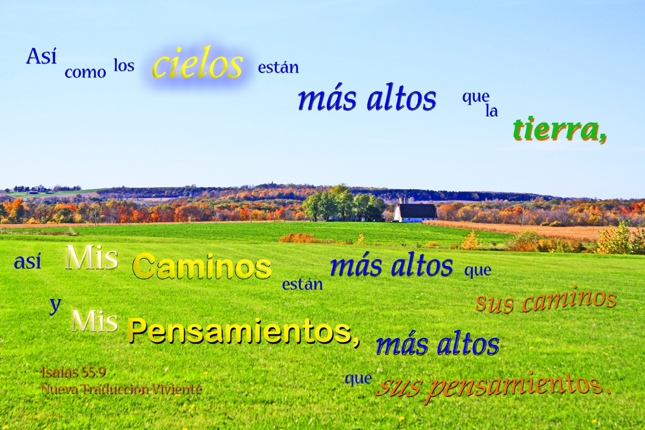Farm field of green backgrounded by trees with autumn leavesPhoto Title: Los Caminos y Pensamientos de Dios Estan Mas Altos
