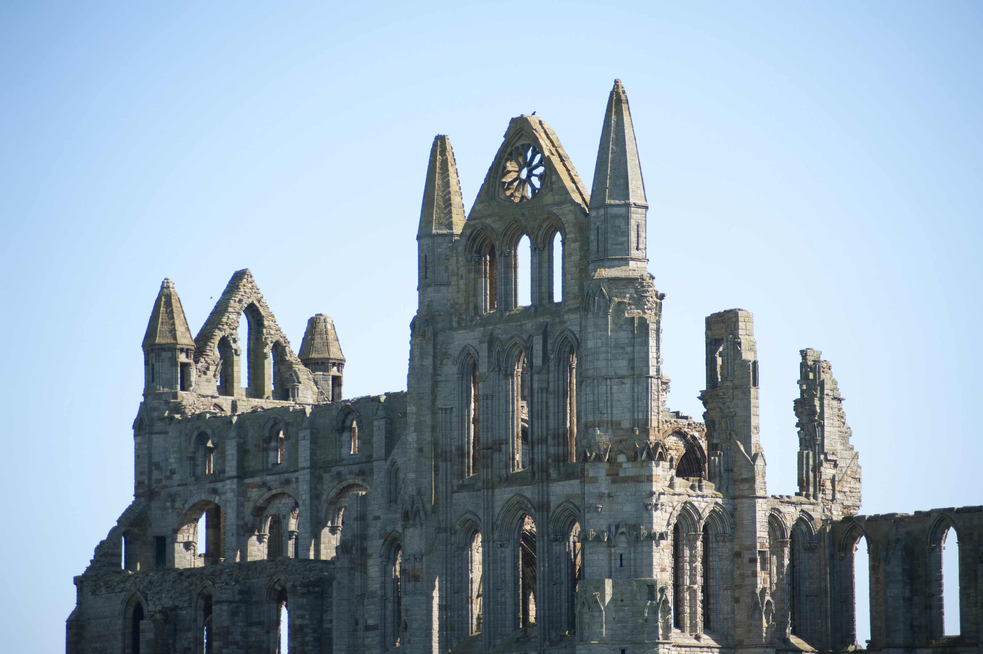 Majestic ruins of Whitby Abbey on the North Yorkshire coast against a clear blue sky
