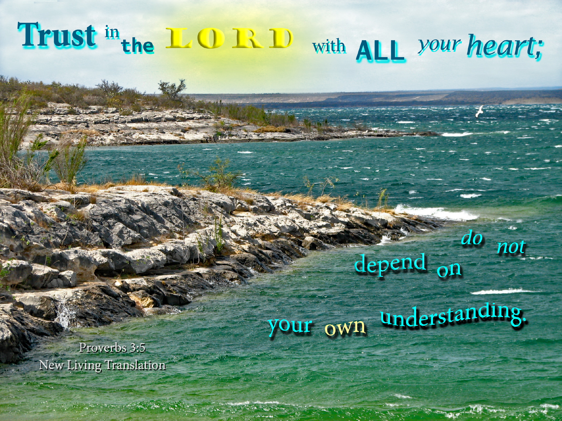 Lake with waves, rock outcroppings and distant hillsPhoto Title: Trust in the Lord