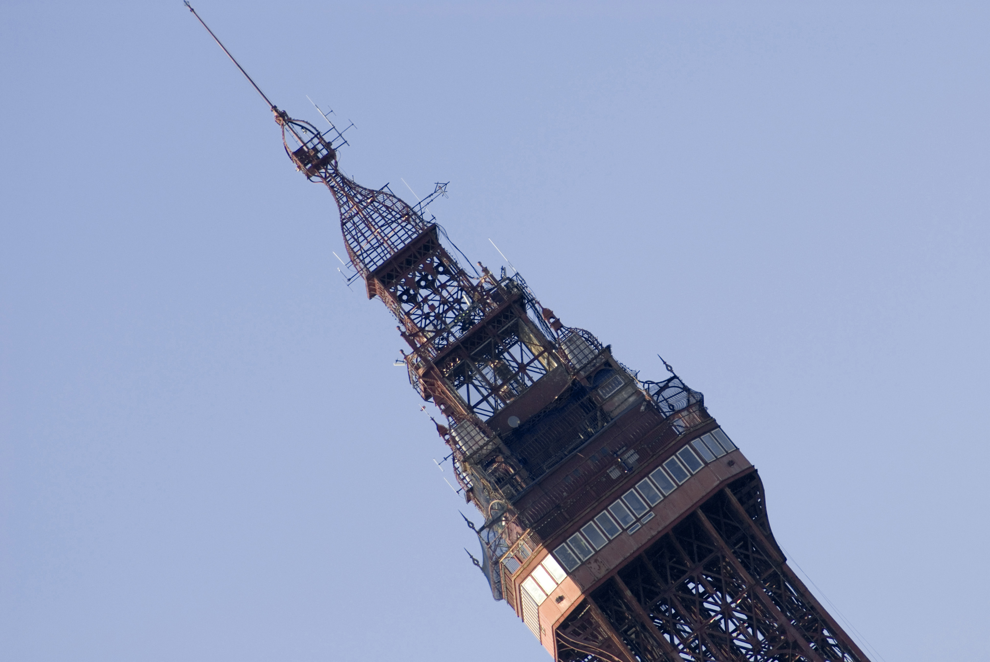 Keywords: travel, building, architecture, angled, victorian, ornate, structure, blue sky, historical, landmark, england, monument, top, tilted, framework, spire, sightseeing, lancashire, blackpool, blackpool tower
