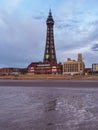 View from the pier across the ocean of the historical Victorian Blackpool Tower and waterfront on a sunny day