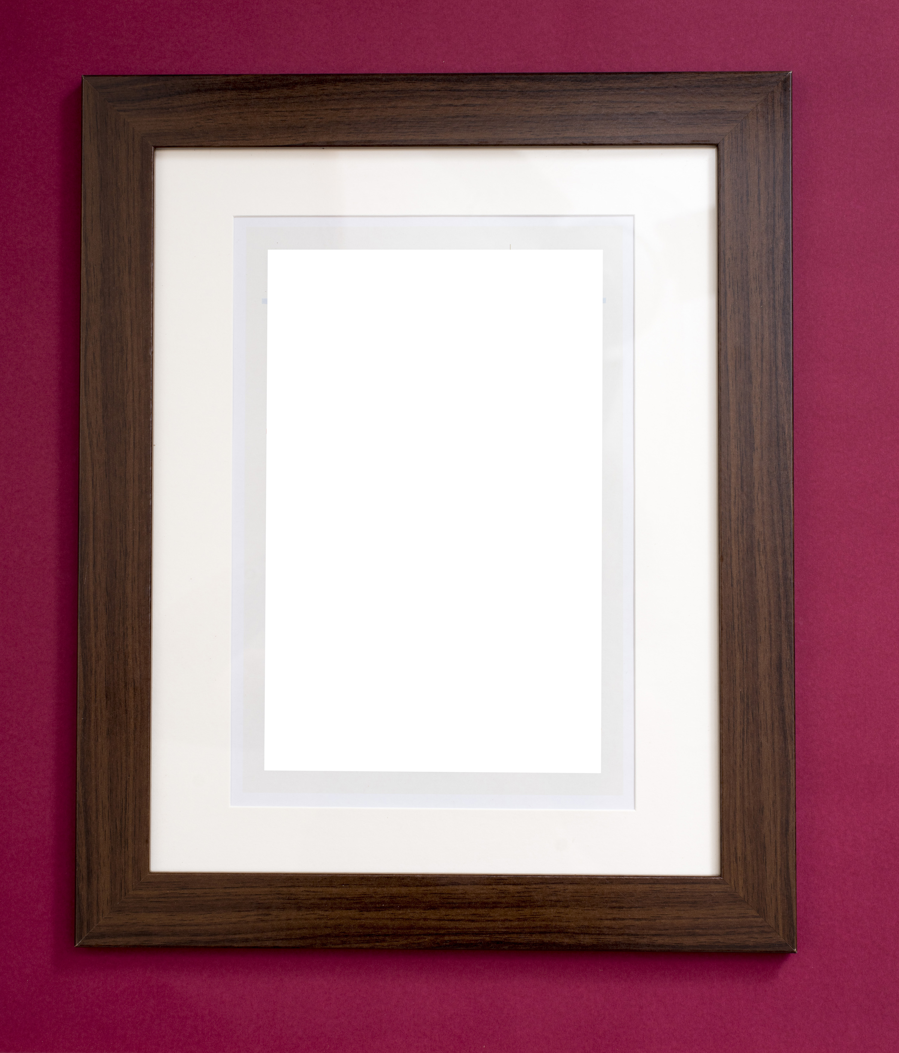 Plain blank wooden picture frame with a black stained border and central white copy space hanging on a burgundy colored wall