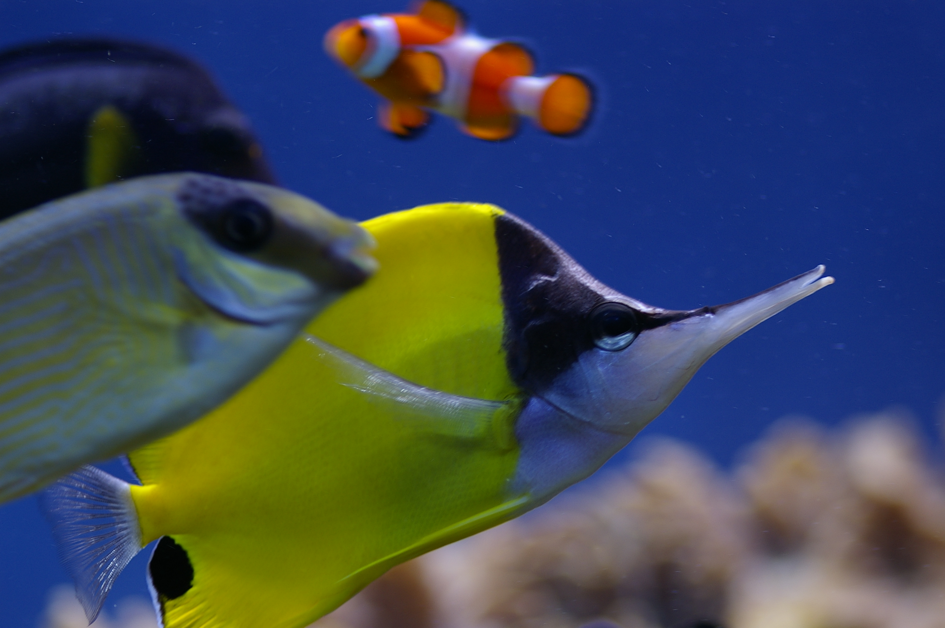 yellow butterfly and clown anenome fish