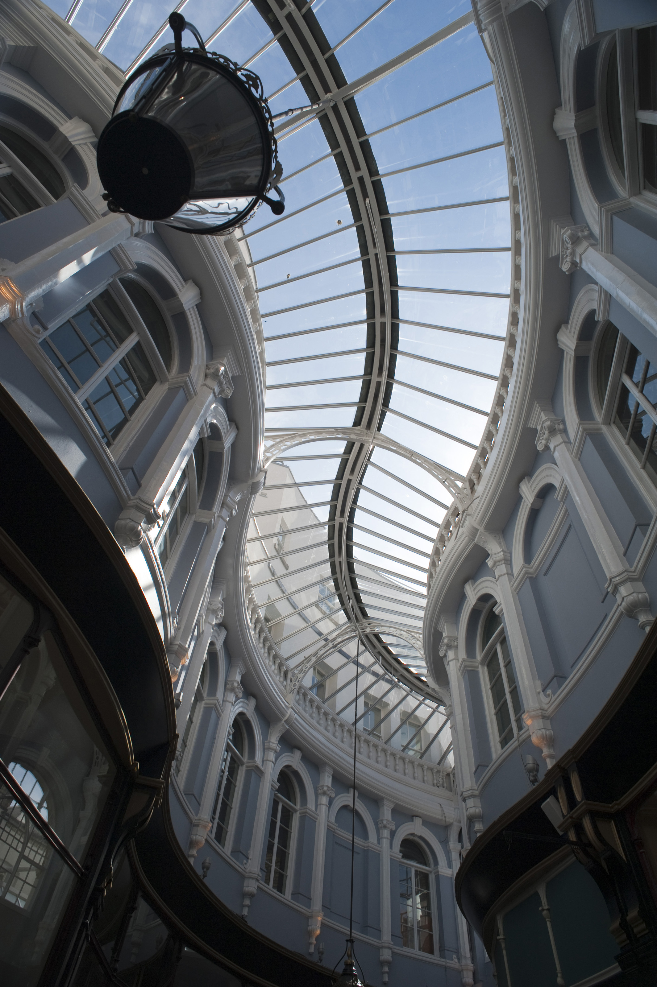 View inside the Morgan Arcade, a shopping arcade in Cardiff of the Venetian windows, some of which are still original, and the stylish curving glass roof which were both restored recently