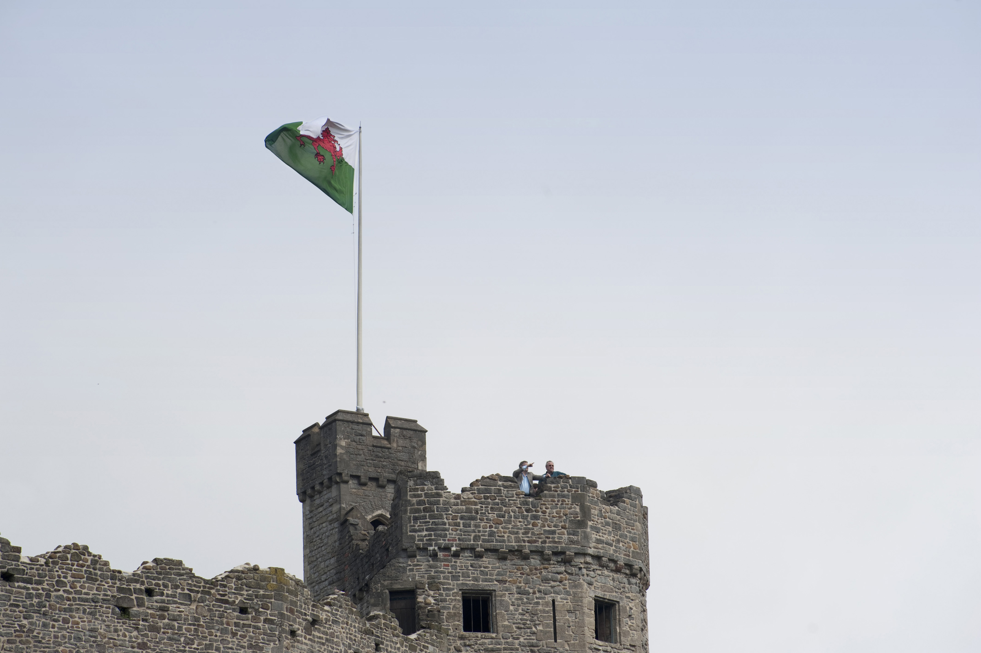 The national flag of Wales with its red dragon flying above the medieval ramparts of the keep at Cardiff Castle