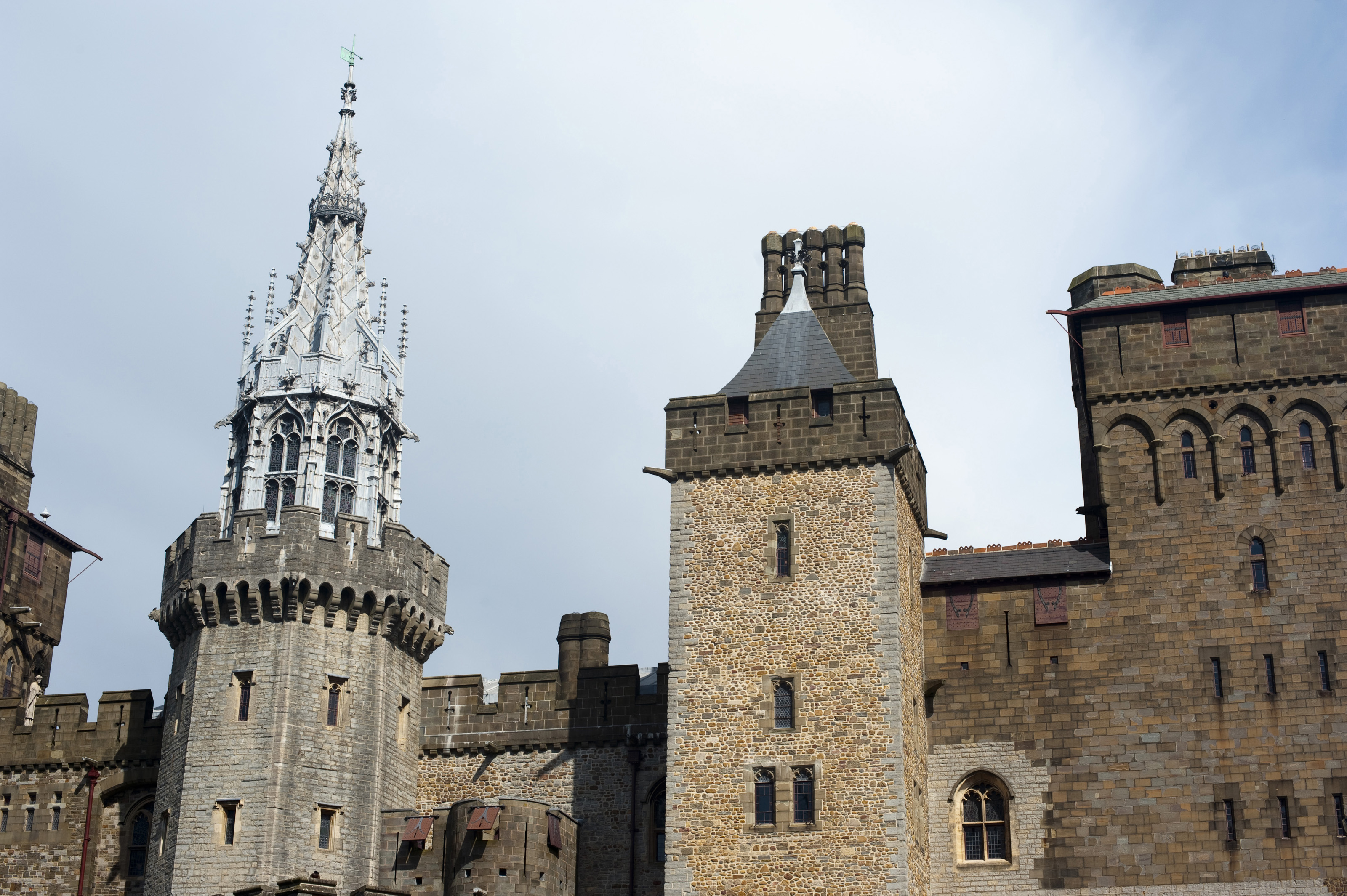 Exterior facade and stonework of Cardiff Castle, Newport, Wales, with an ornate Gothic spire topping an octagonal tower