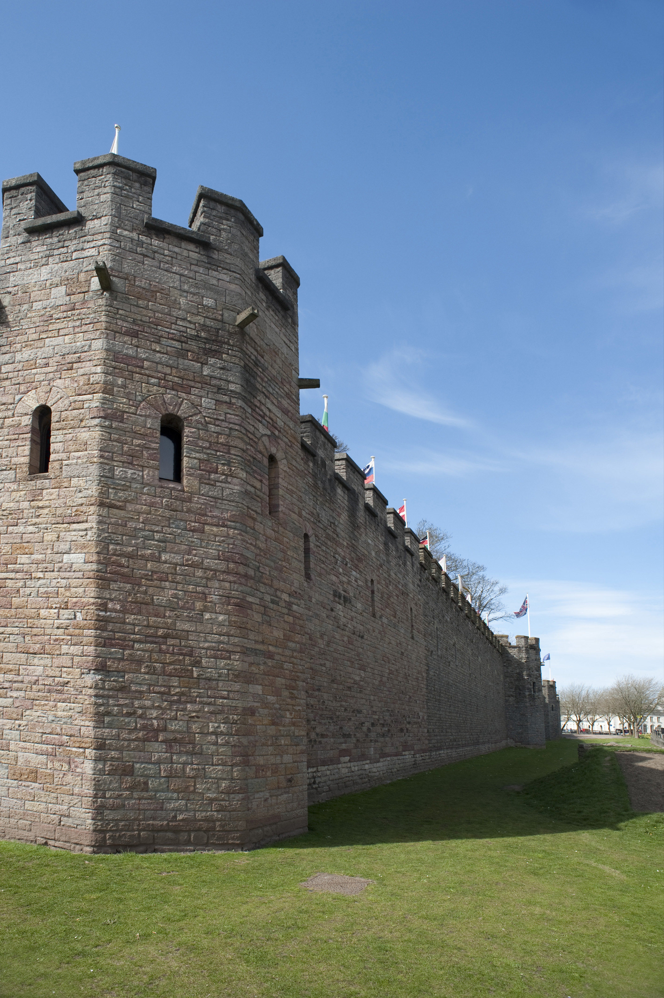 View down the length of the historical crenallated stone walls surrounding Cardiff Castle