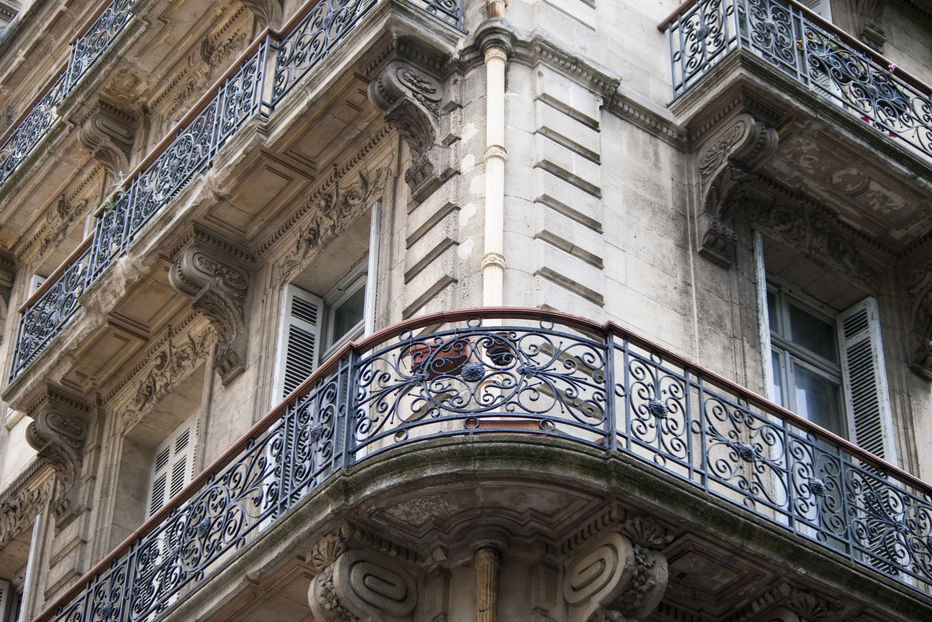 Keywords: corner, balcony, balconies, building, french, fance, town, rows, levels, cast iron, facade, corbel