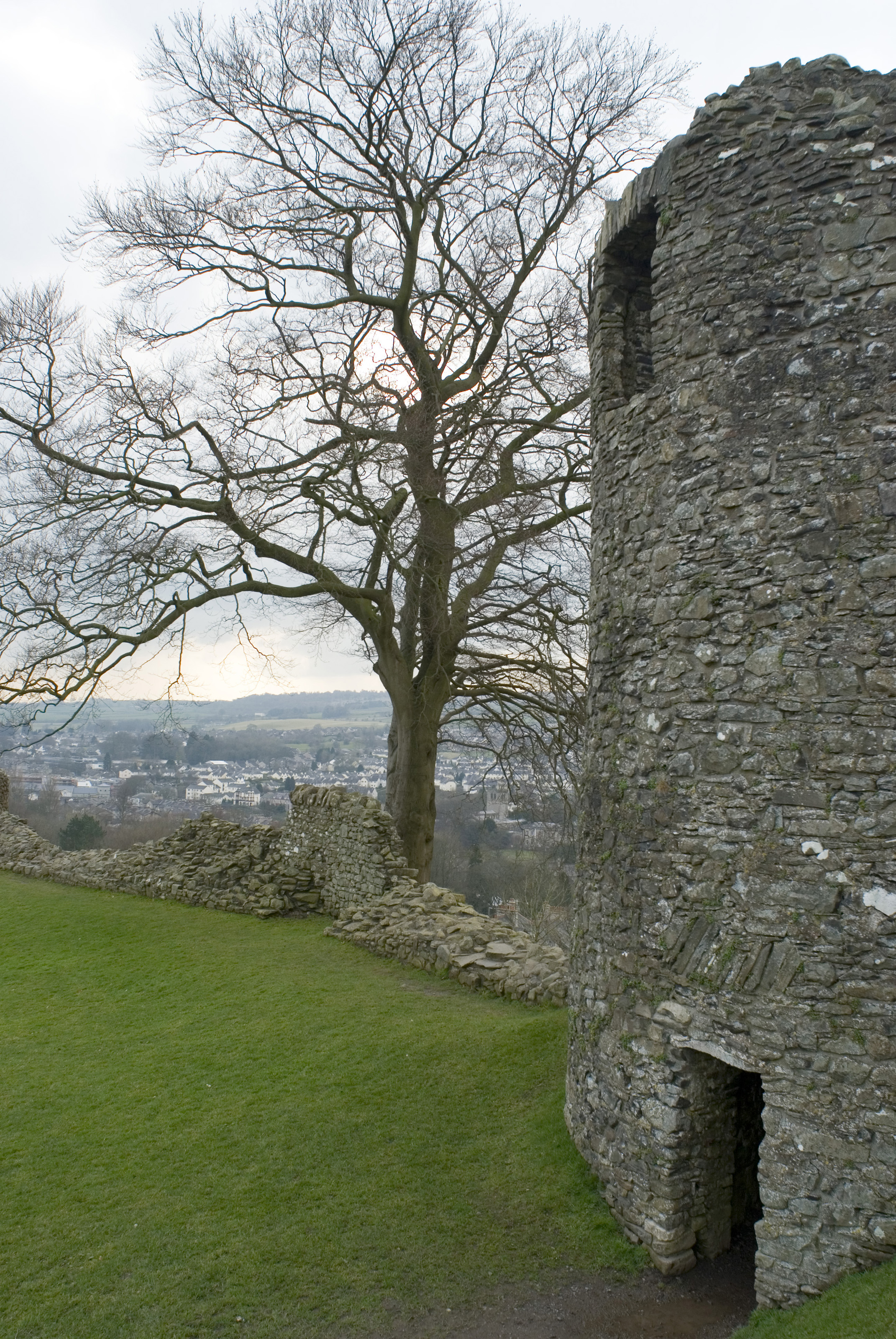 View past the ruined stone wall and tower at Kendal Castle, Cumbria, England to a bare branched tree and the countryside and town beyond