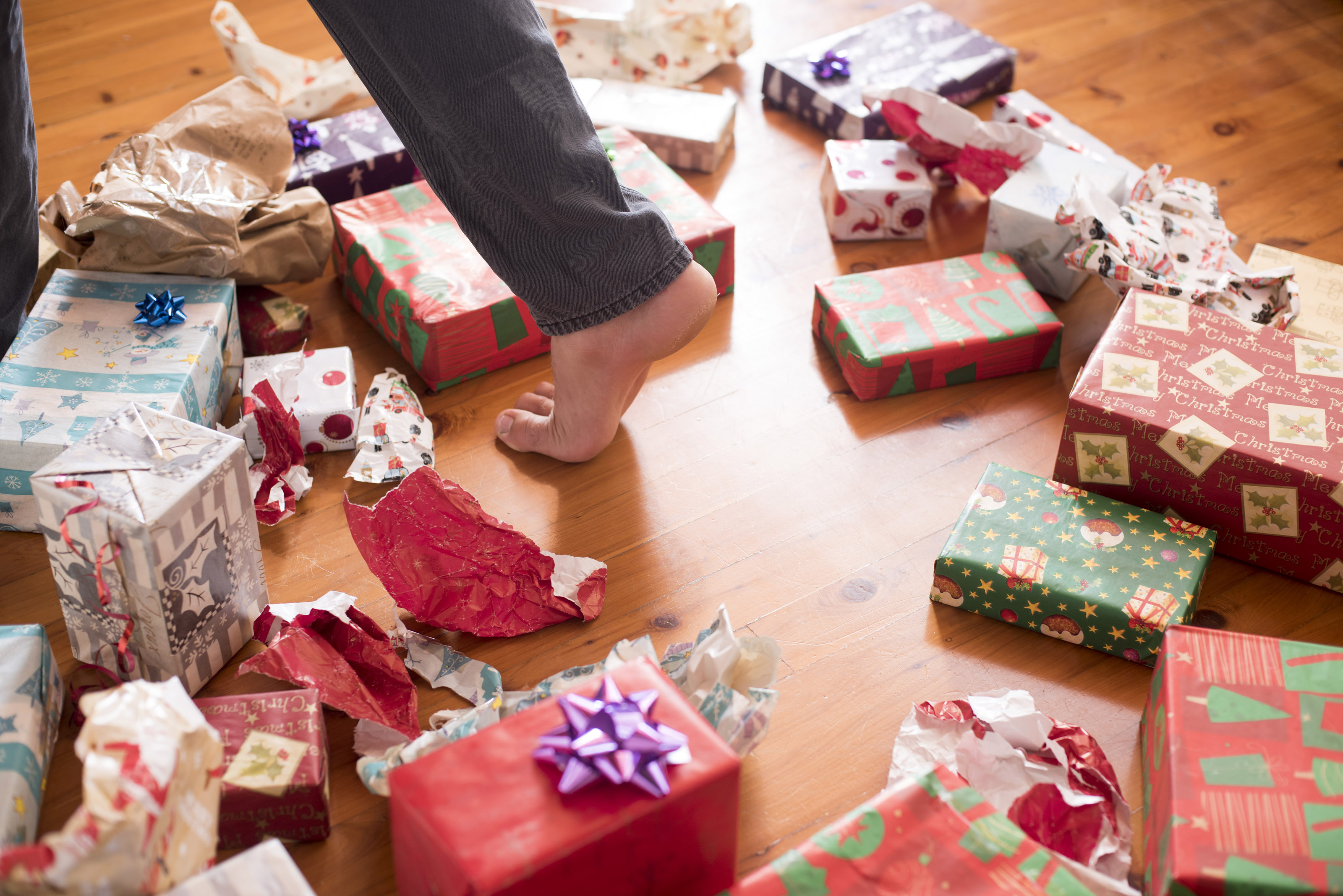 Christmas day concept with a bunch of gift boxes on the floor at home and a person foot stepping over it