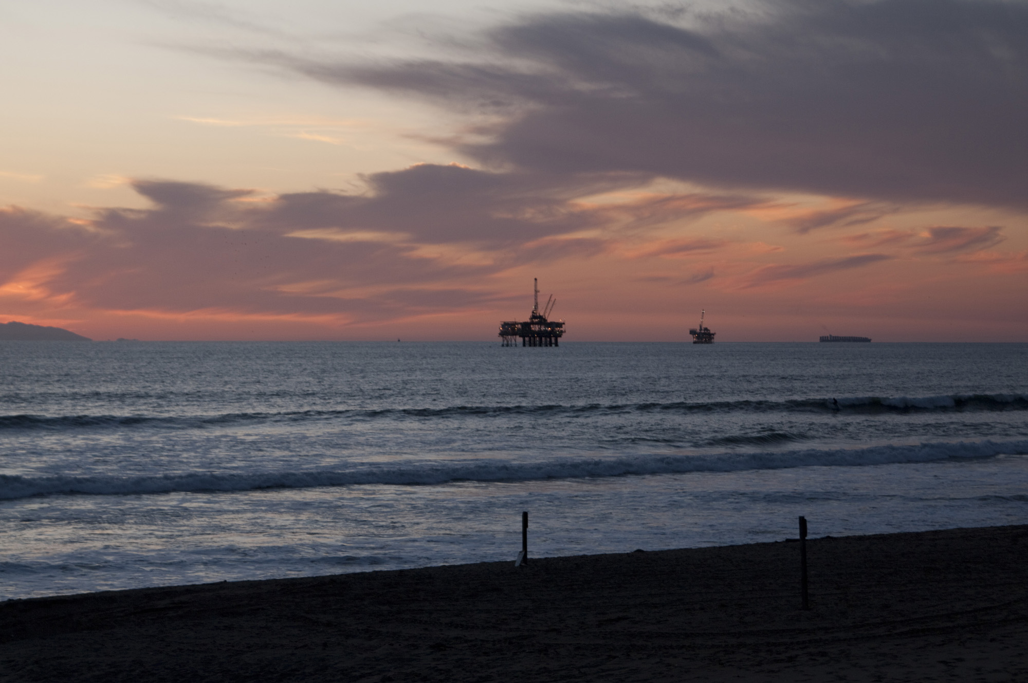 oil rings off the california coast at sunset