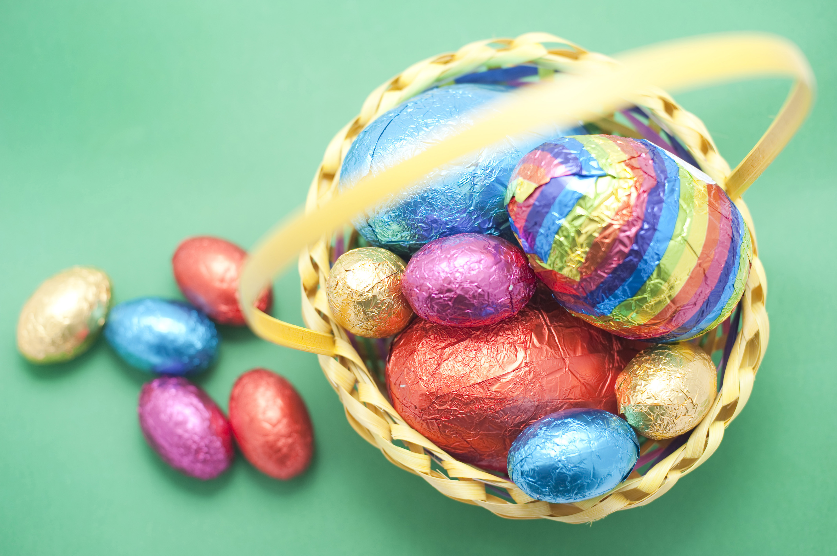 Keywords: holiday, colourful, foil, celebration, festive, candy, chocolate, collection, eggs, egg, easter, basket, wrapped, confectionery, overhead