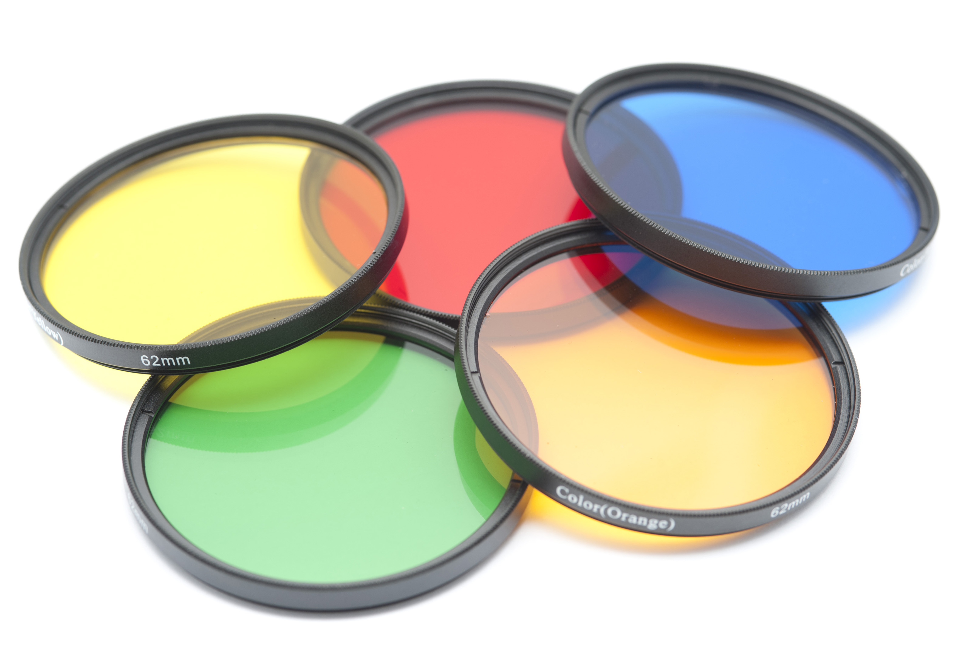 Close up on a set of five isolated color contrast photography lenses in yellow, red, blue, green and orange