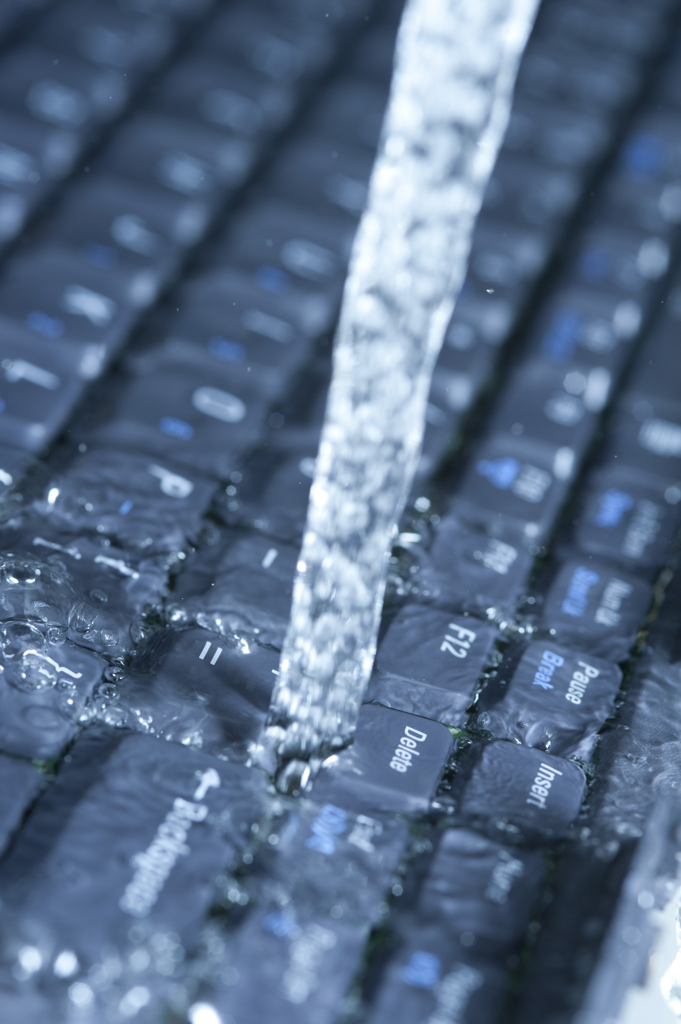 Data stream concept with running water onto computer keyboard, viewed in closeup