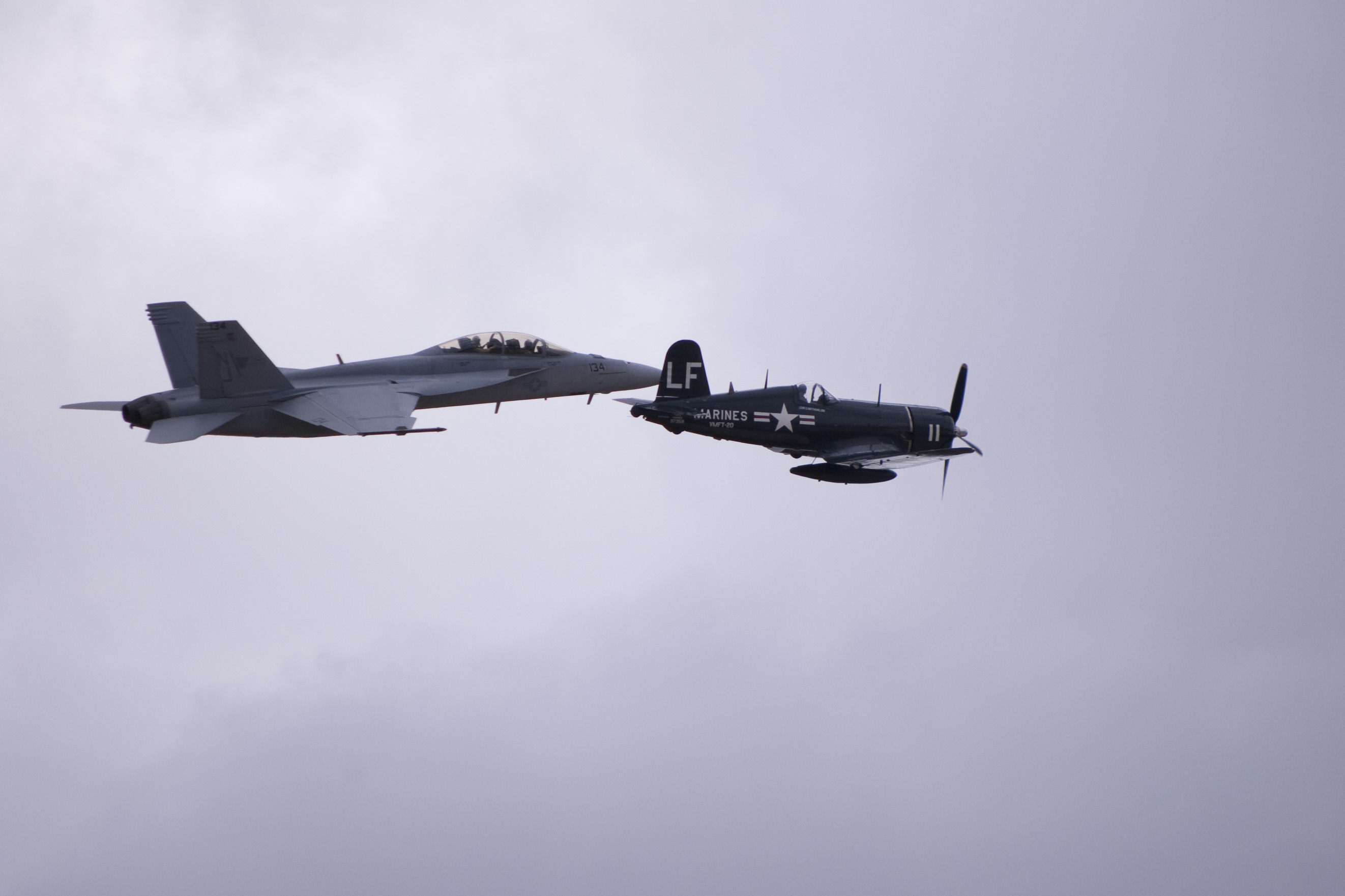a navy F4U Corsair and a FA18 jet flighter in flight, old an new together