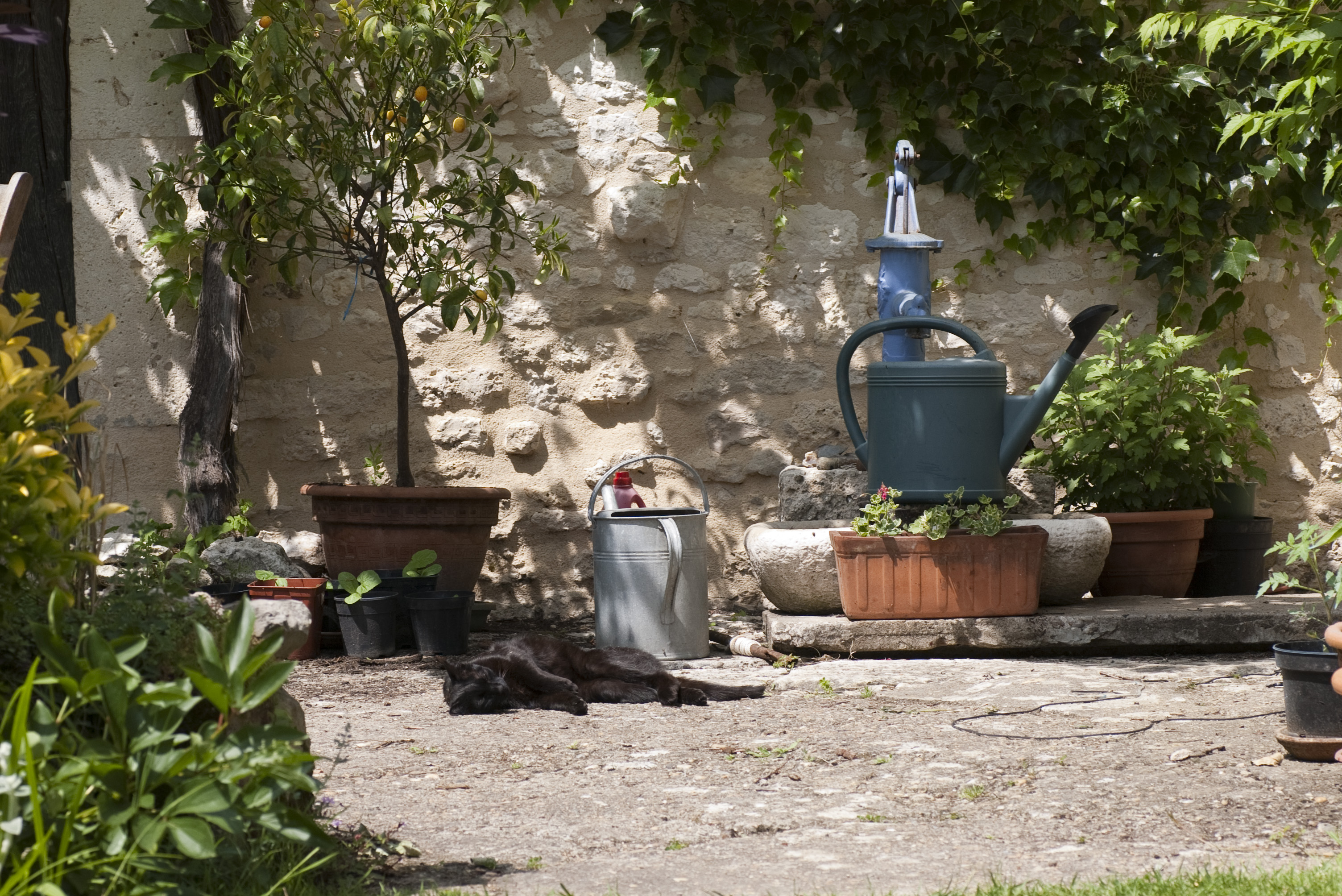 Keywords: garden, pump, hand pump, water, watering can, stone, wall, courtyard, garden, lemon tree, plants, kitchen garden