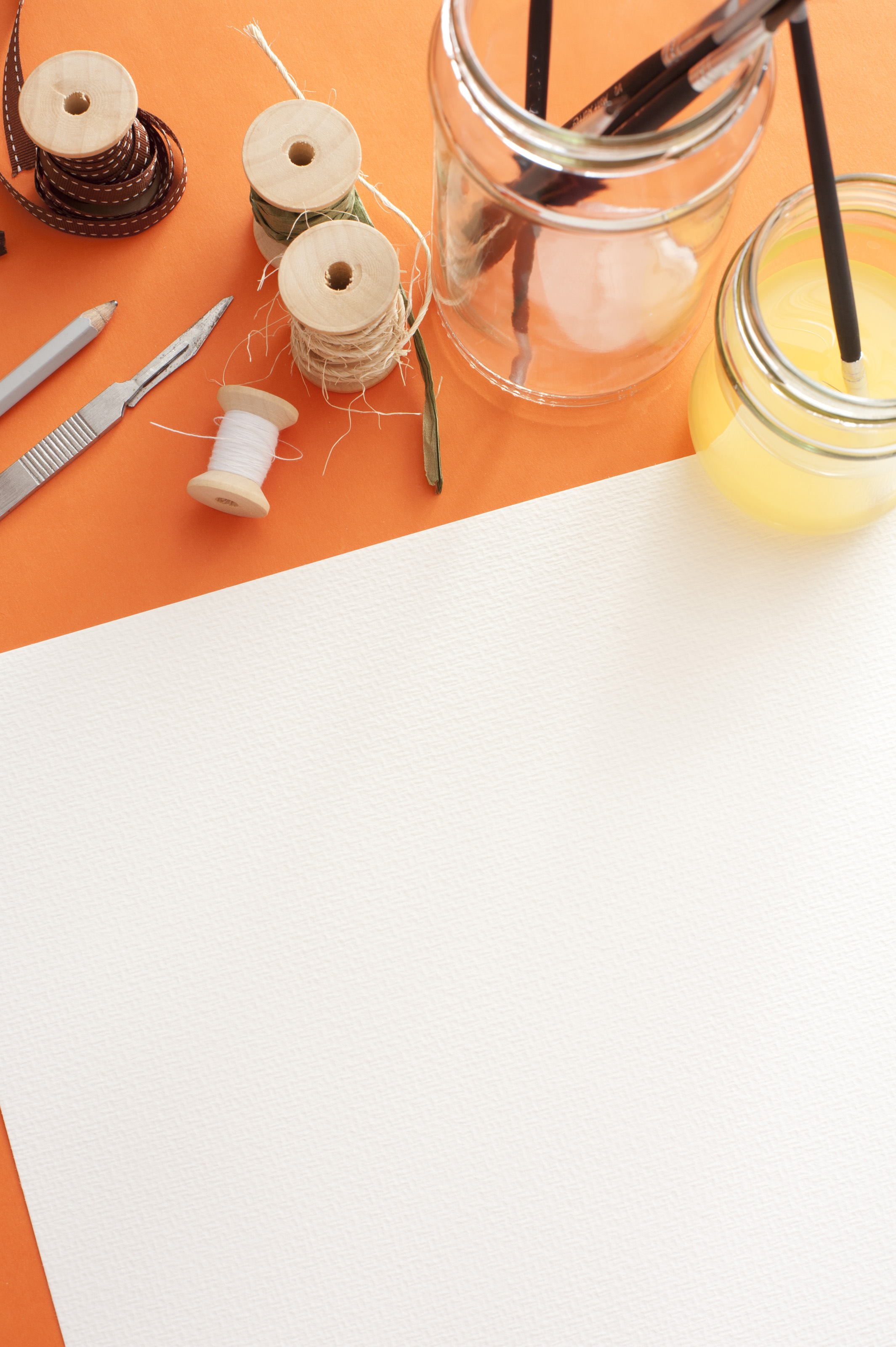 Keywords: blank, brushes, copy space, creativity, inspiration, knife, paint, paper, scalpel, spools, supplies, thread, blade, crafts, art, orange, ocre