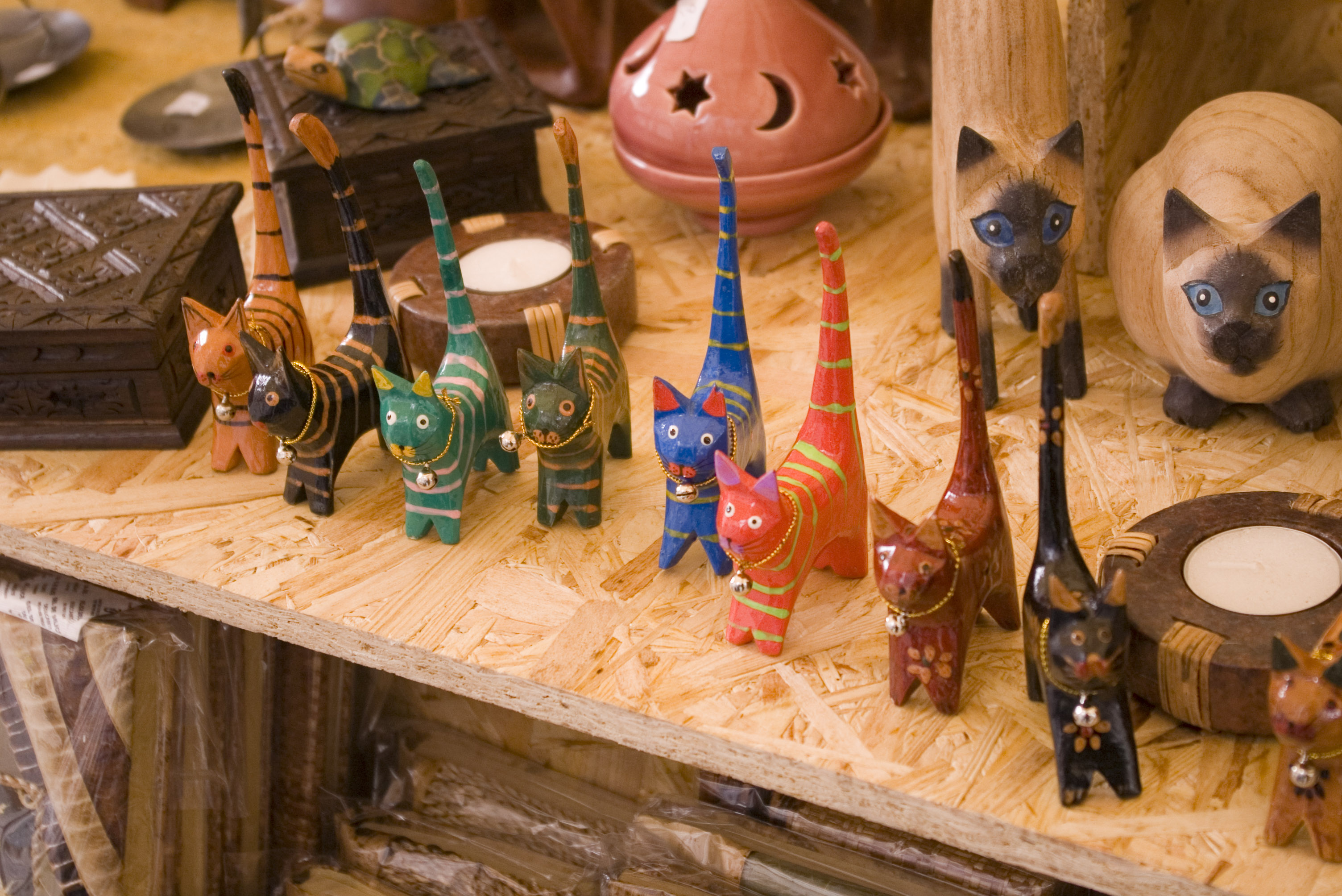 a craft shop display of wooden carved cats