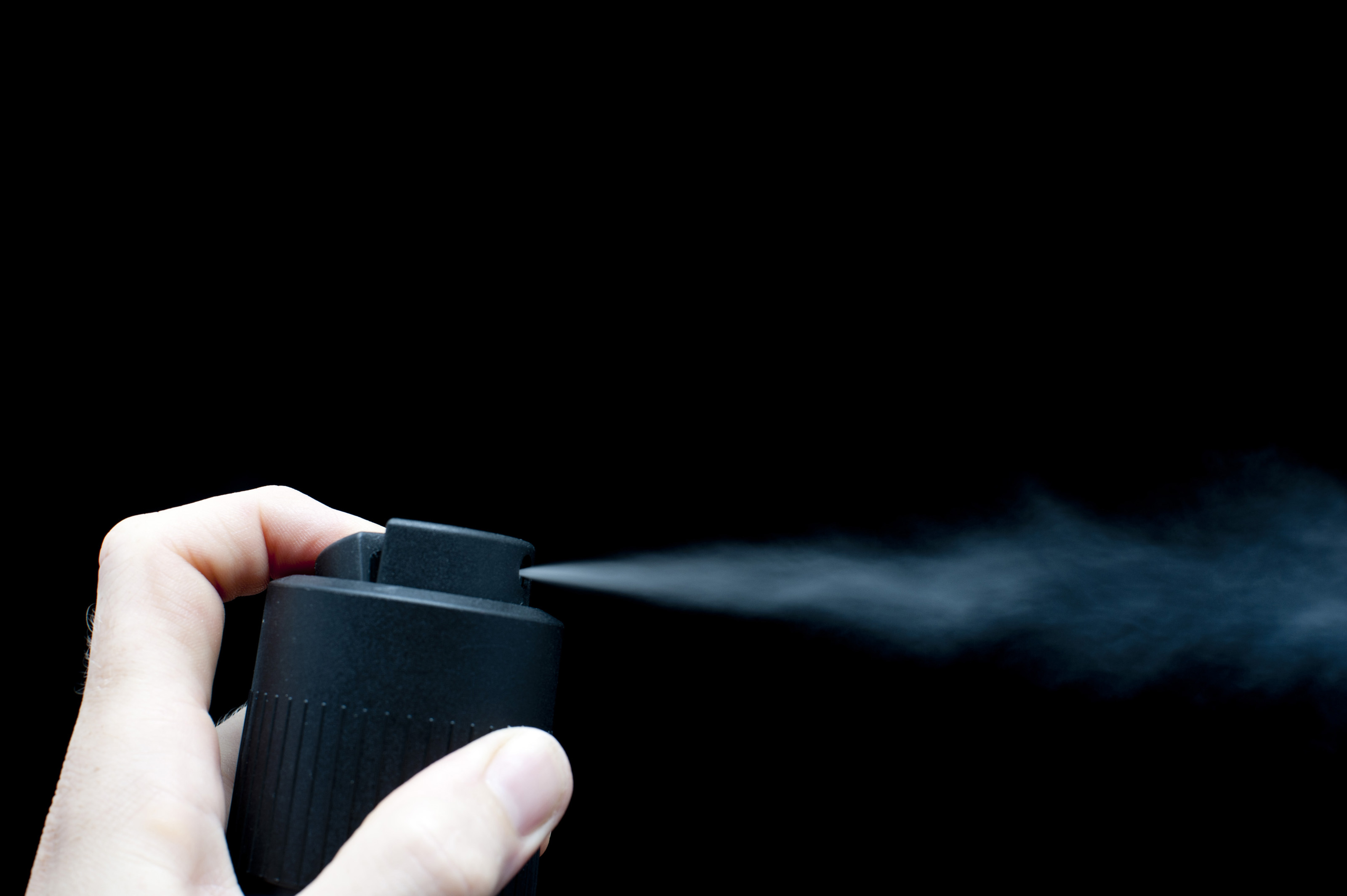 Man using a plain black spray can depressing his finger to emit a fine burst of vapour over black