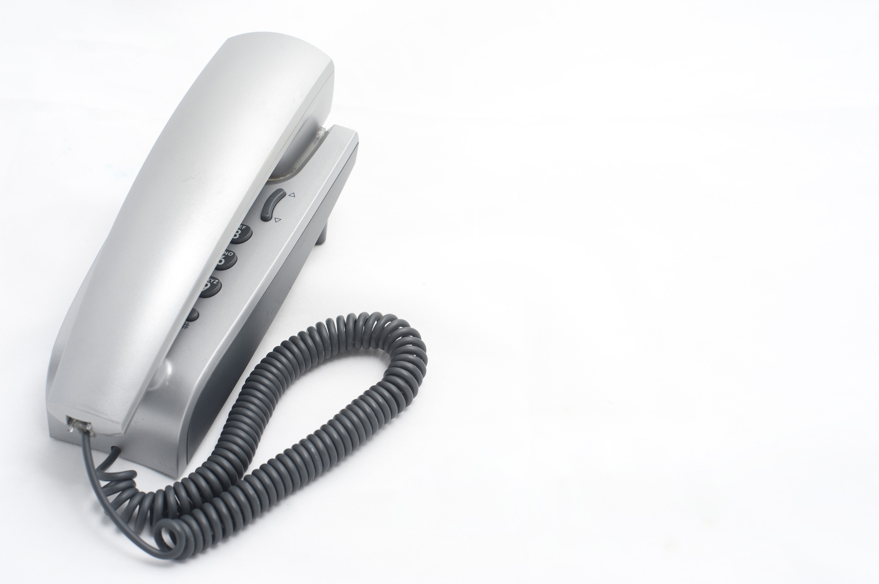 Keywords: copy space, text, iobject, macro, closeup, isolated, cutout, phone, telephone, corded, wire, coil, coiled, push button, touchtone, pushbutton