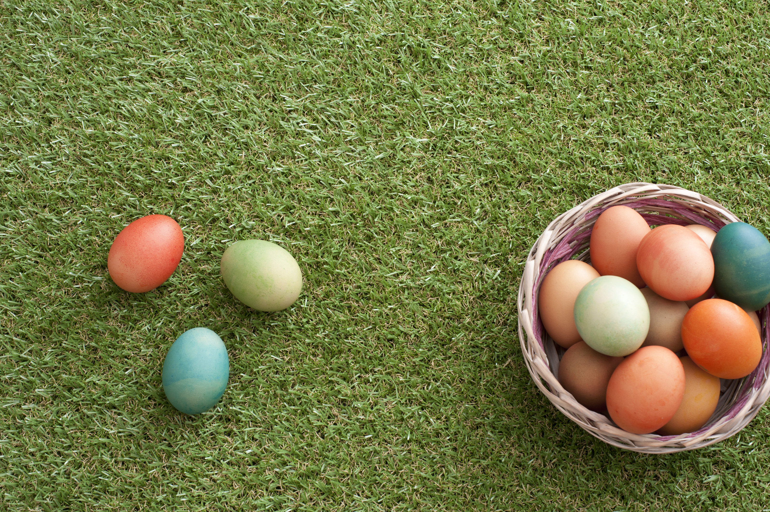 Keywords: colorful, dyed, easter, eggs, holiday, basket, homemade, kids, wicker, grass, green, spring, greeting, wishes, background
