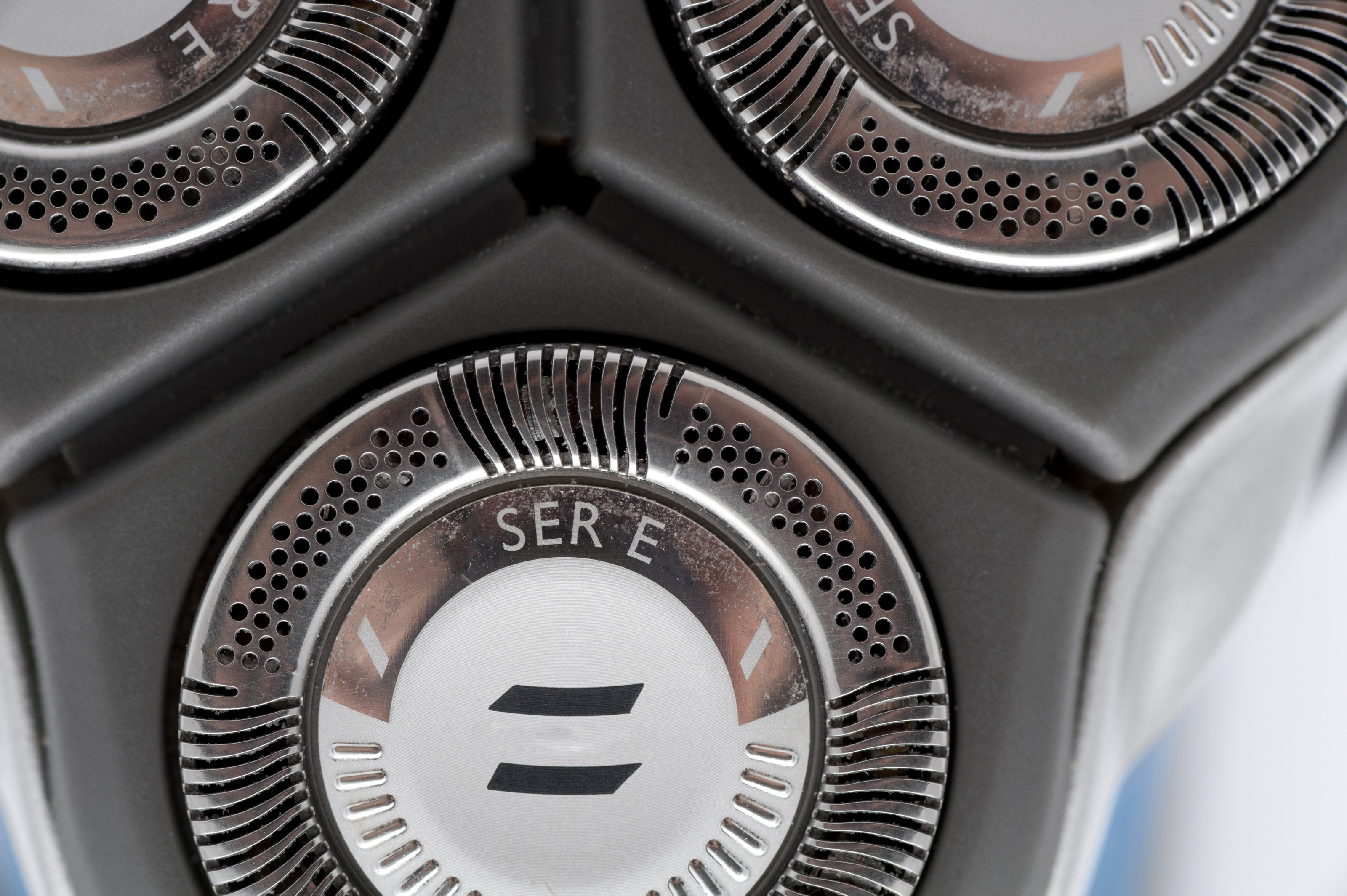 Closeup of one of the three circular stainless steel blades of an electric shaver for trimming facial hair