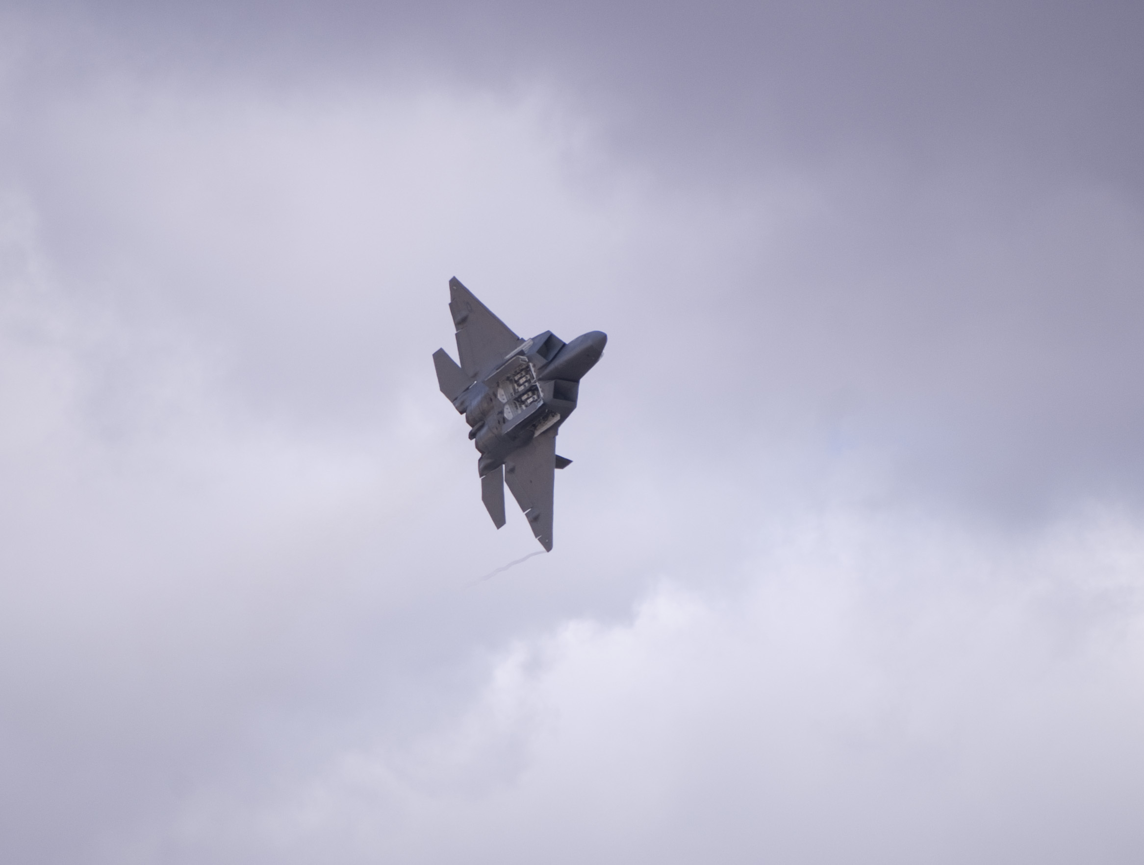 Lockheed Martin F-22 Raptor with it's weapons bay doors open revealing centre and two smaller side weapons bays, weapons are hidden inside bays in the aircraft to maintain stealth