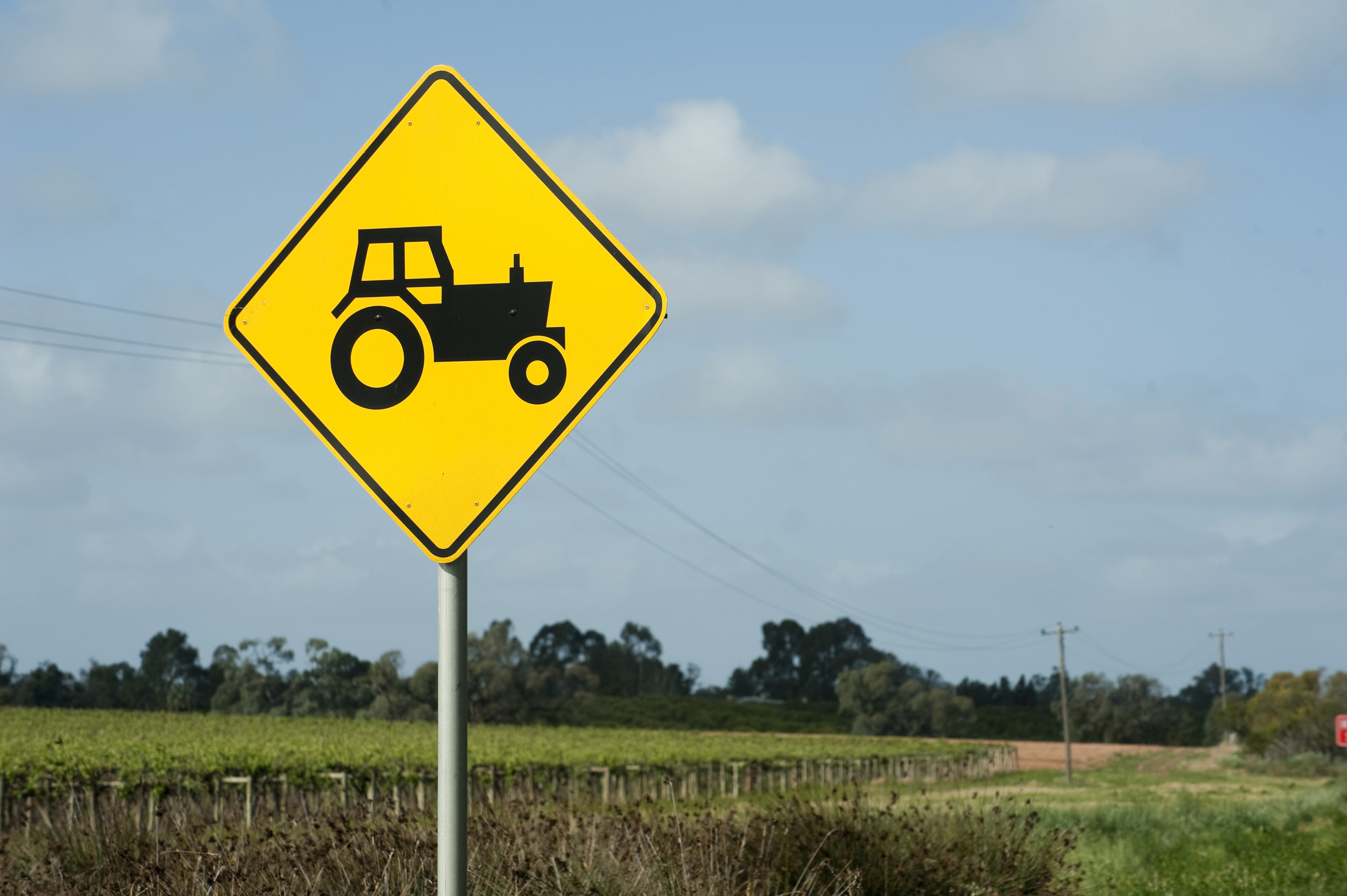Keywords: agriculture, equipment, farm, farmland, field, machinery, rural, sign, tractor, traffic, vehicles, warning, communication, information, yellow