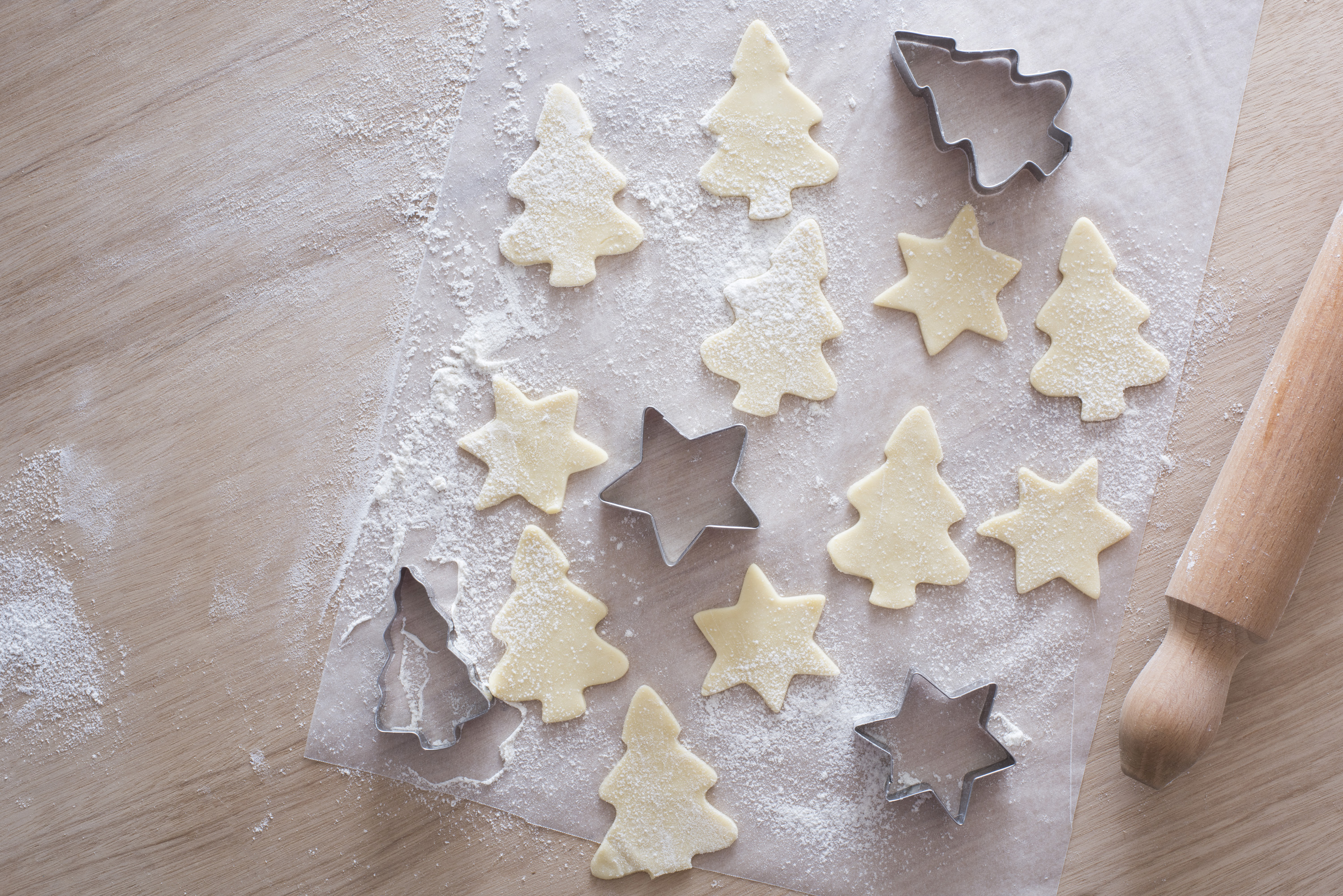 Overhead view of unbaked tree and star shaped cookies beside tin cutters and rolling pin
