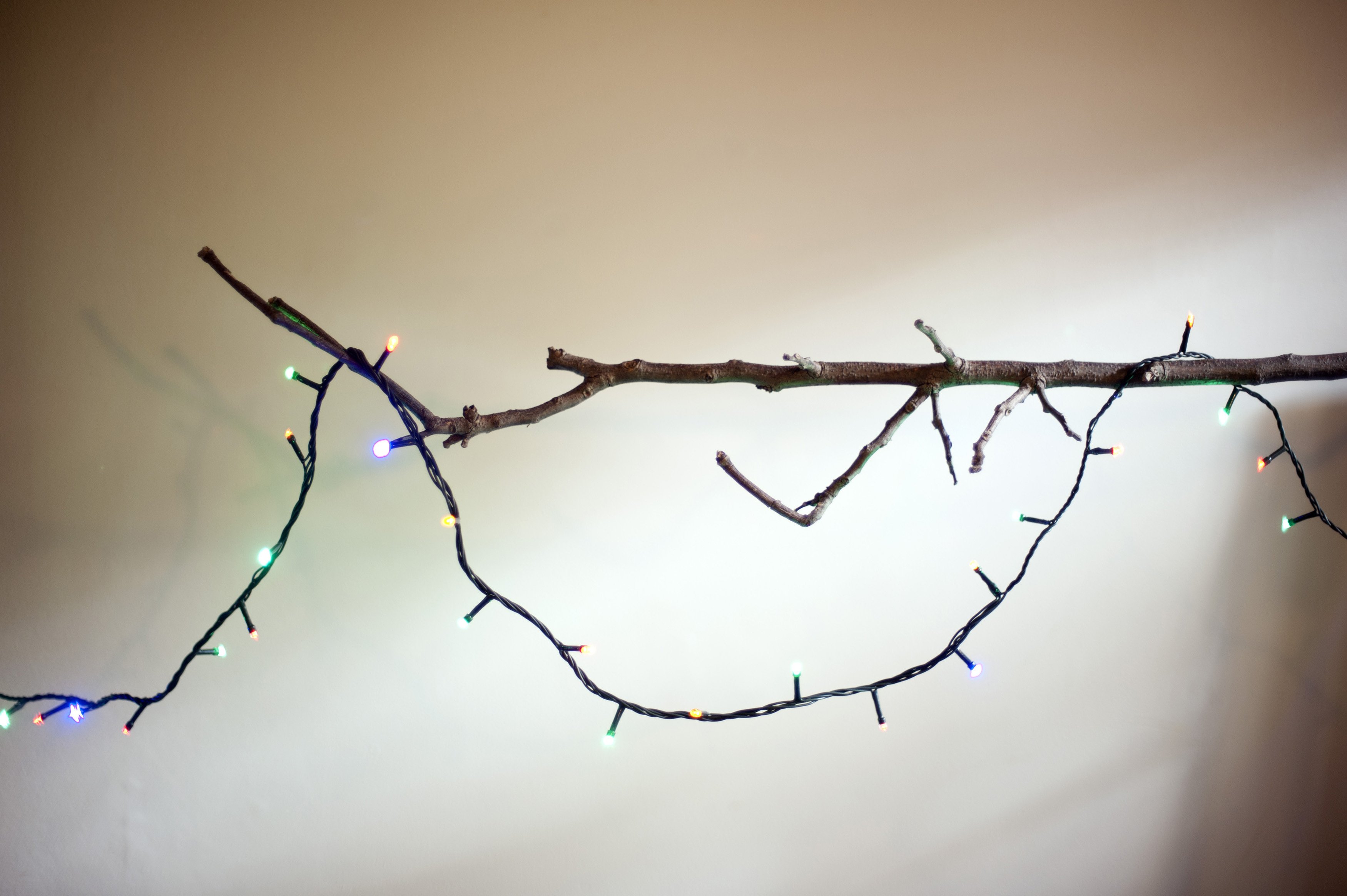 Minimalist Christmas with a dried leafless festive Christmas branch decorated with a looped string of colorful shining lights