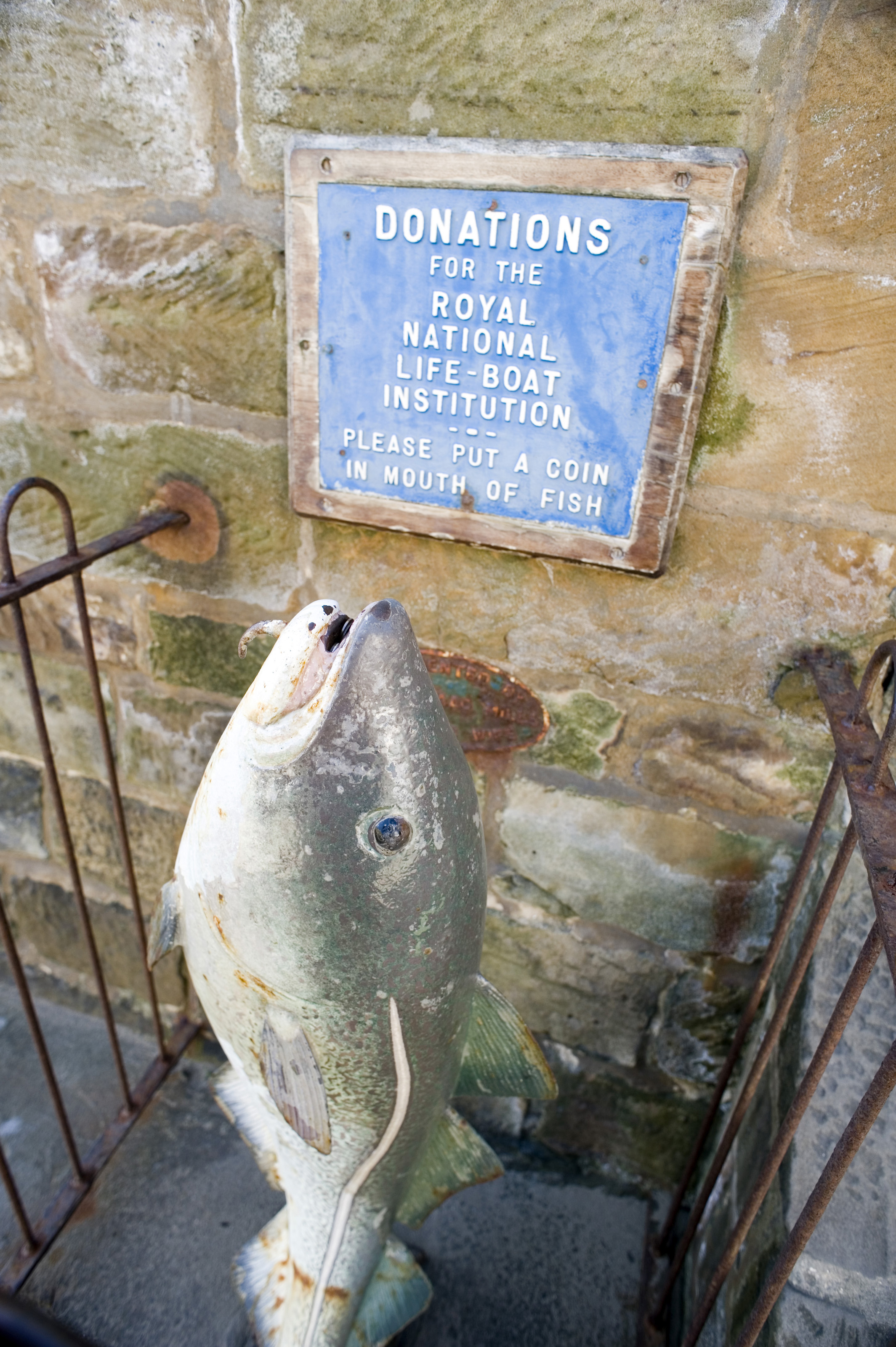 Fish shaped donations box for the Royal National Lifeboat Institution in Robin Hoods Bay, North Yorkshire