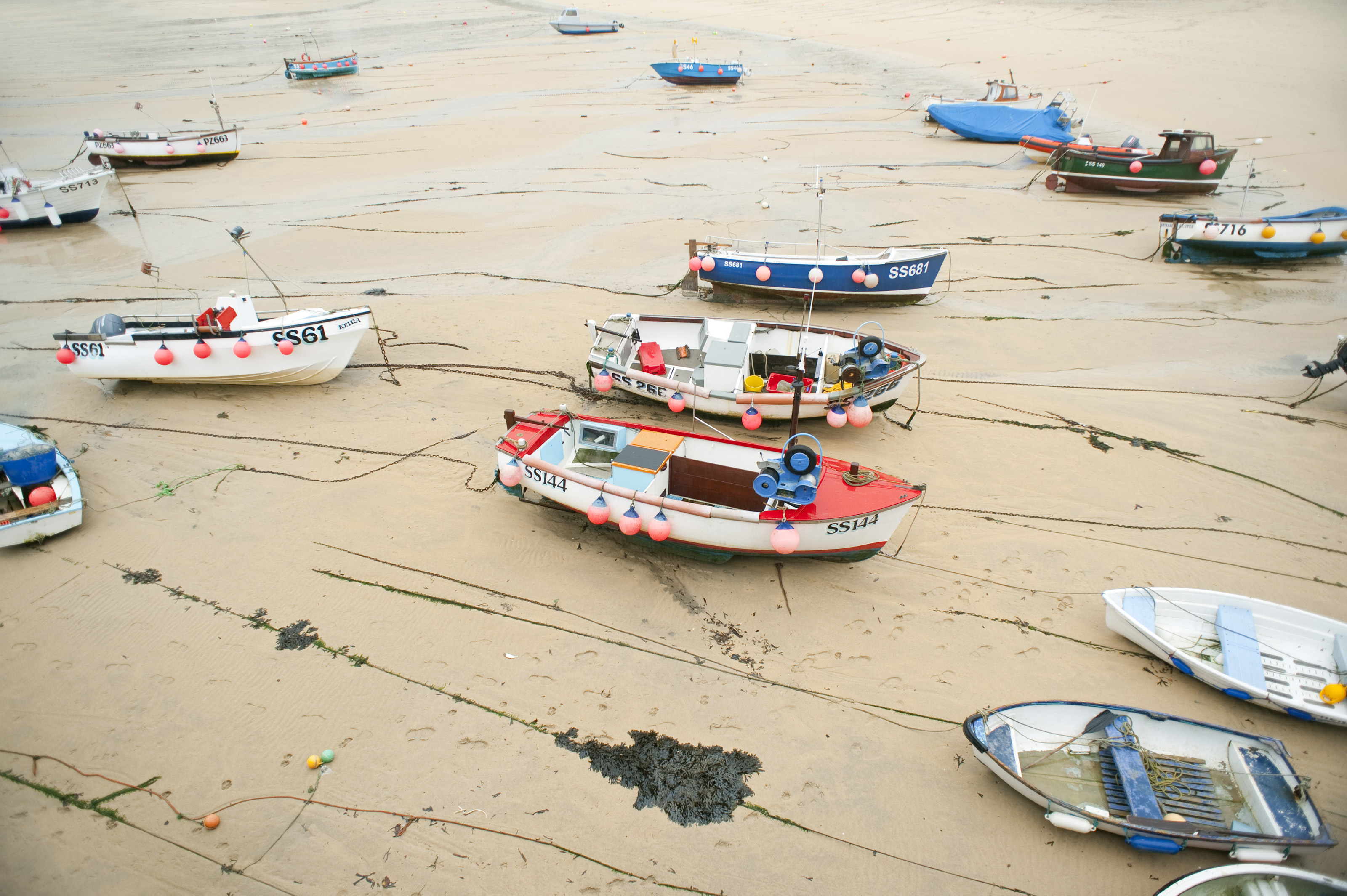 Keywords: travel, transport, craft, coastal, marine, fishing, sandy, boating, harbour, low tide, tidal, beached, dinghy, moored, high angle, cornish, cornwall, fenders, st ives, saint ives