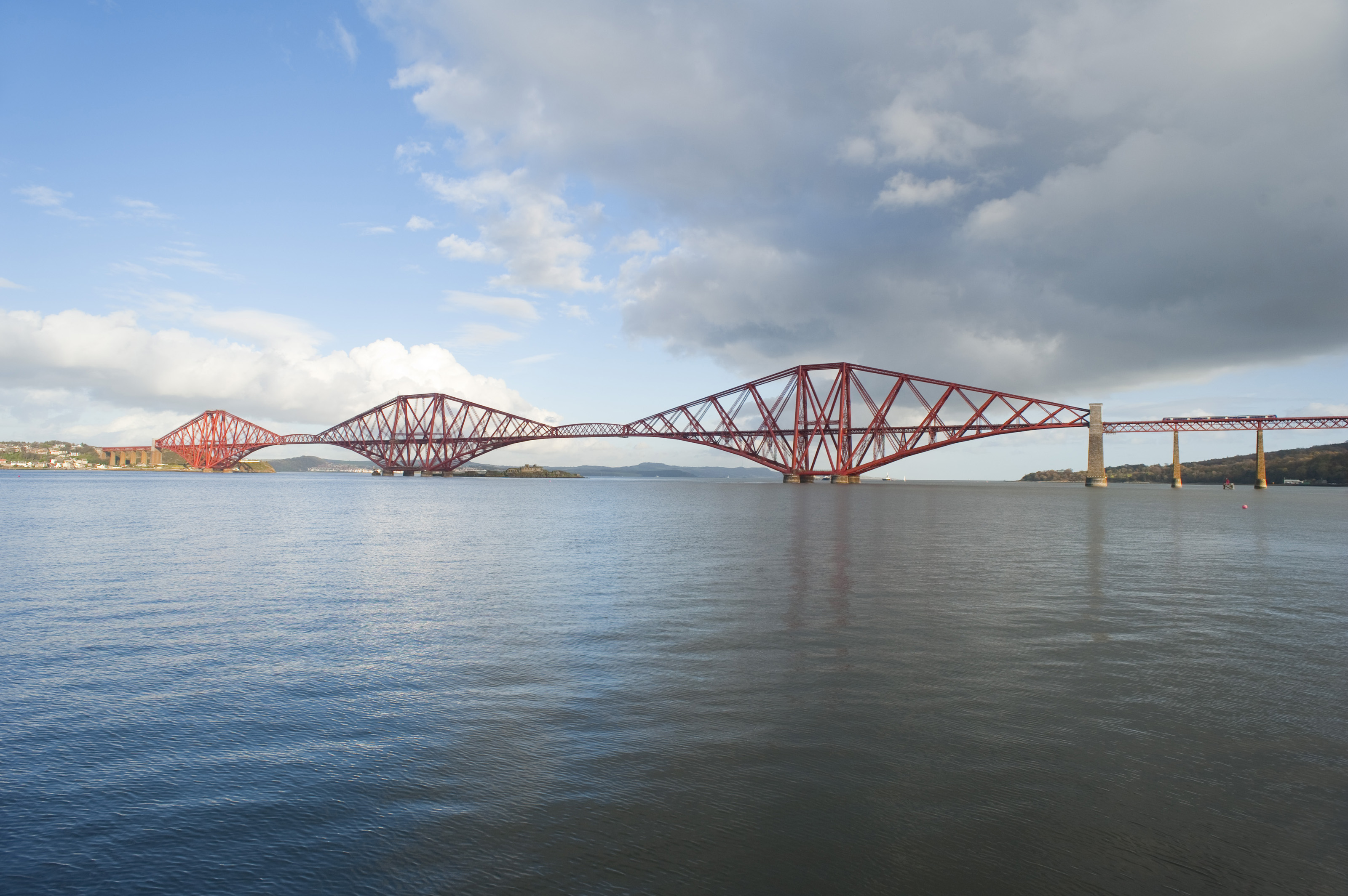 Keywords: edinburgh, scotland, forth bridge, forth rail bridge, sunny, day, daytime, clouds, sky, water, calm, fair weather, reflection, span, truss, trestle, train, small, wide angle, panoramic, view, scenic