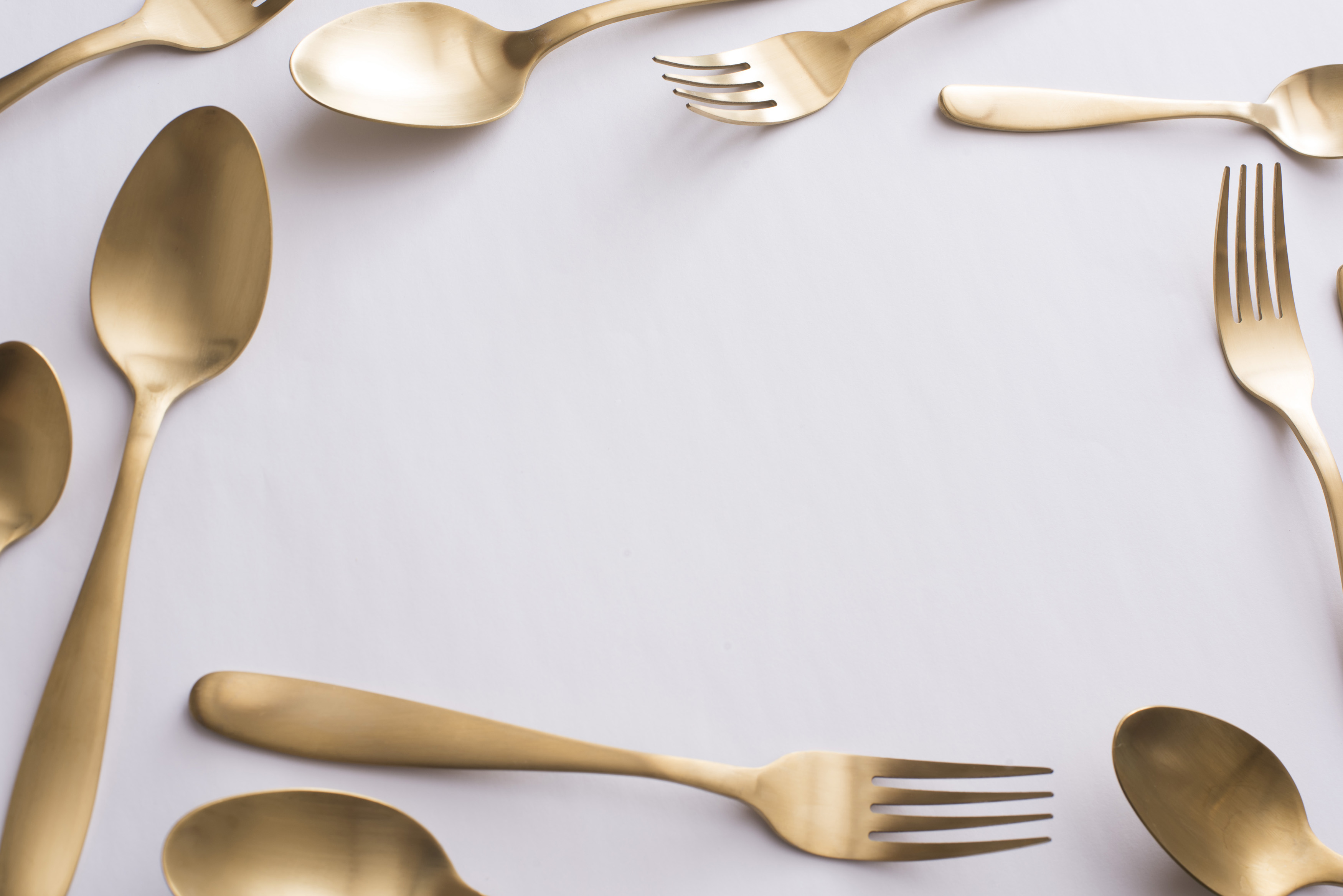 Food or catering frame with assorted cutlery, spoons and forks, around a central white copy space for your menu or recipe