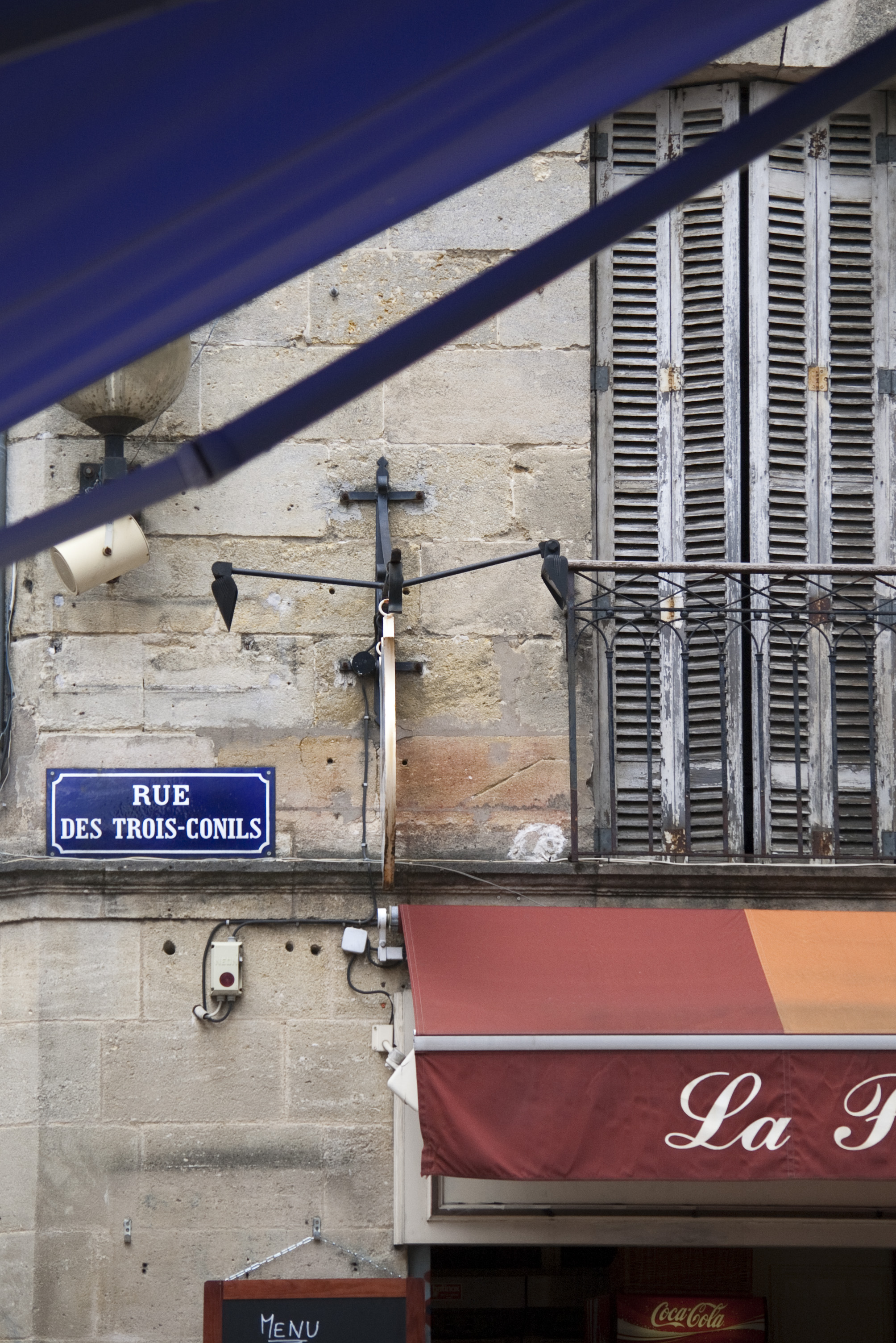 details of a french town street, blue enamel street sign, cafe awning, and shuttered windows