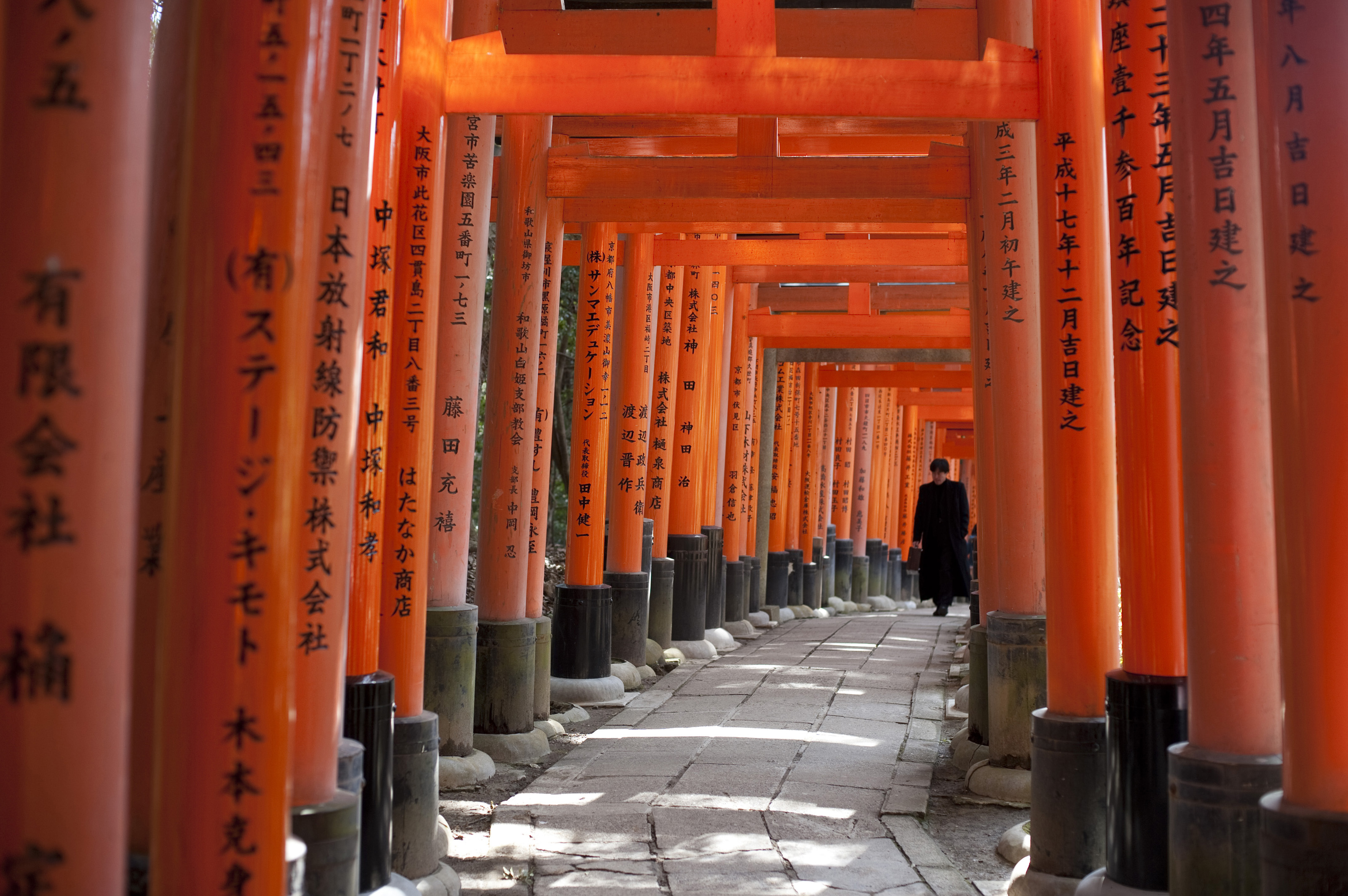 Keywords: red, path, inari, fushimi inari-taisha, kyoto, japan, person, gate, walkway, pedestrian, shrine, inscribed, torii, tunnel, religious, buddhist, pillars, paved, offerings, locals