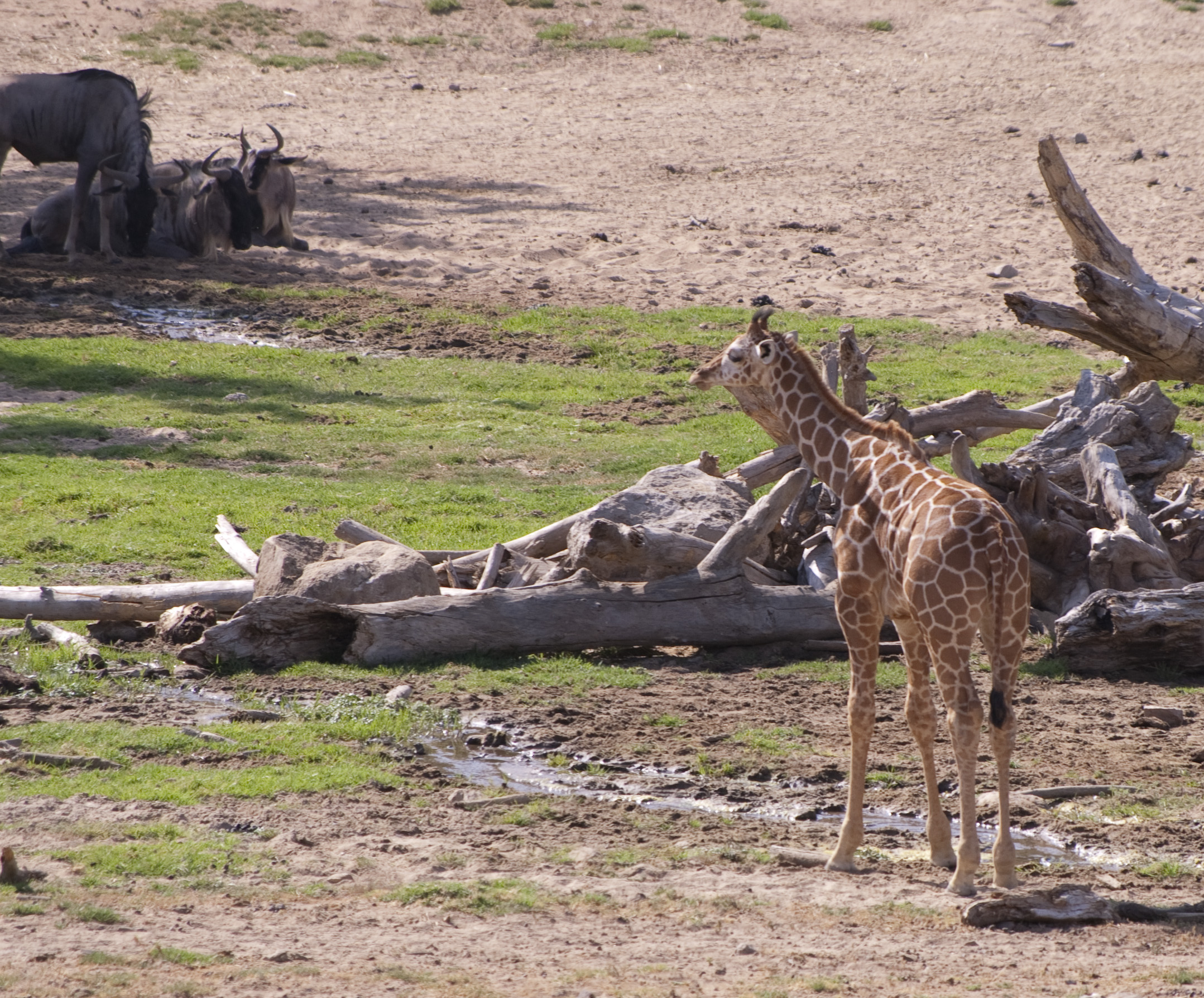 a giraffe and bison in the background