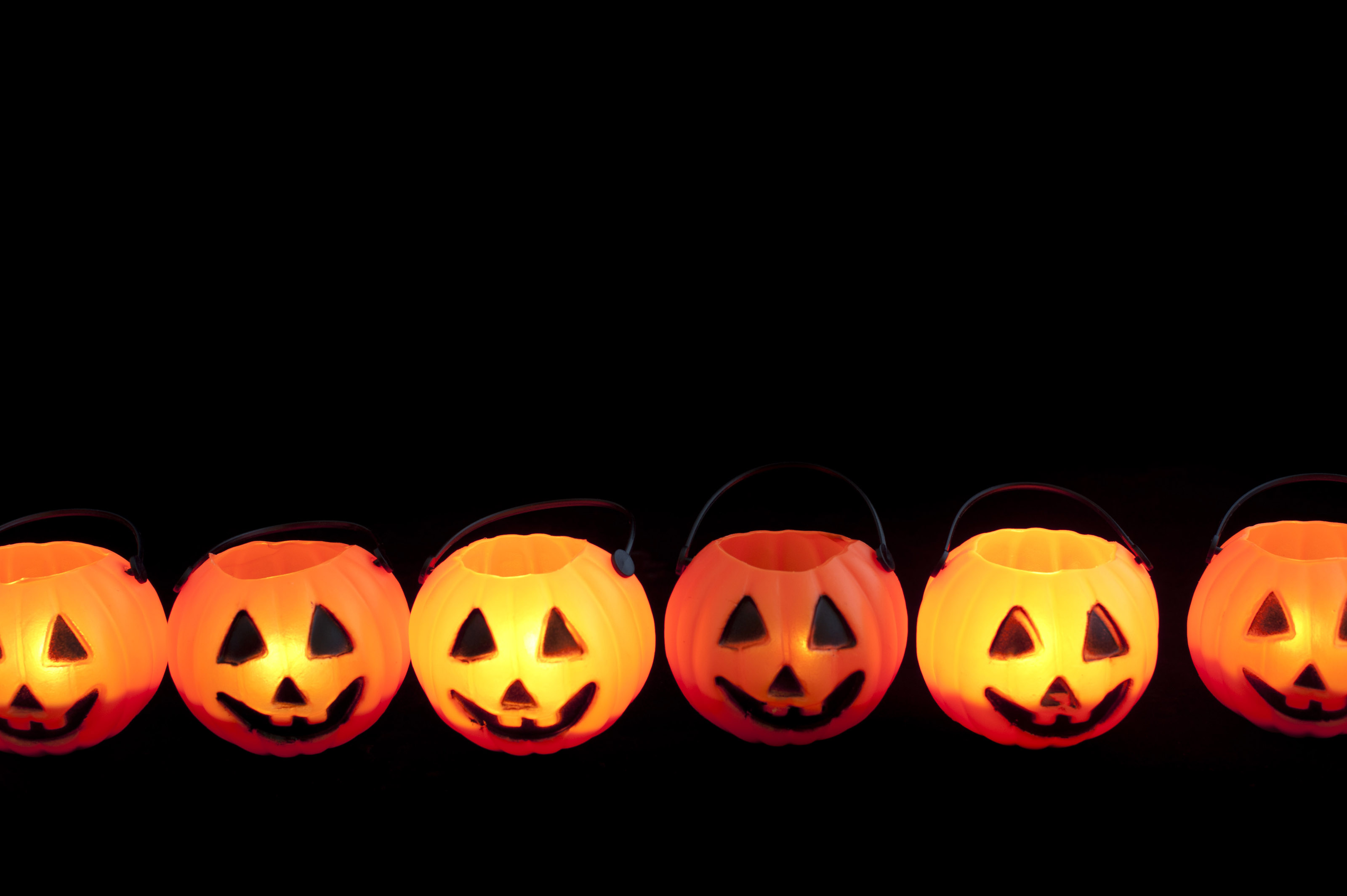 Line of Halloween pumpkin jack-o-lanterns glowing in the dark with plenty of copyspace above for your greeting or invitation