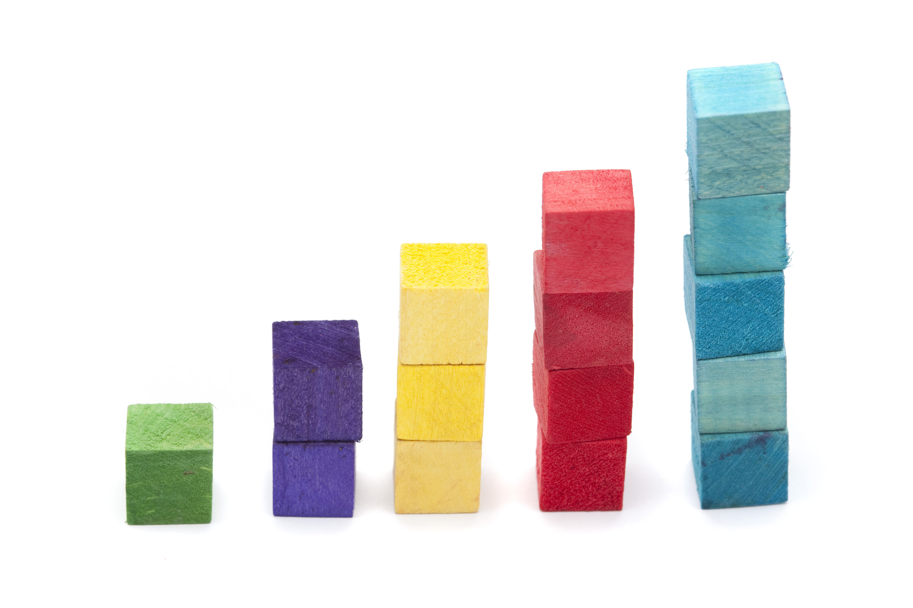 Growing concept represented by stacks of colourful wooden toy building blocks in increasing heights