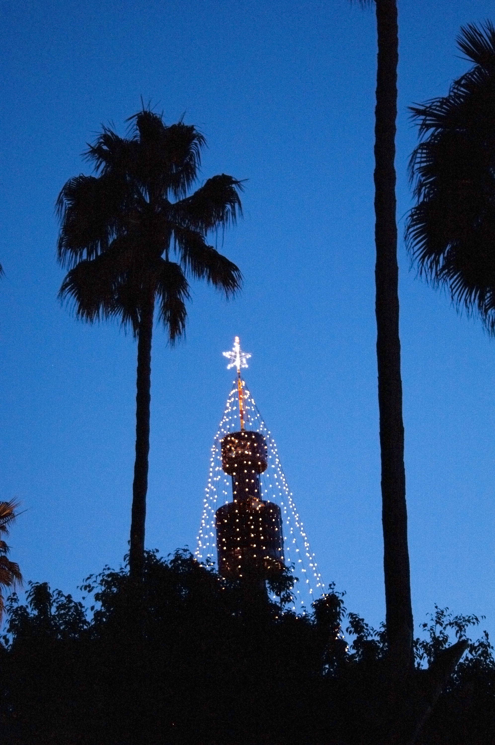 Keywords: holidays, christmas, seasonal, festive, christmas, lights, streamers, tower, decorated, glowing, sunset, dark
