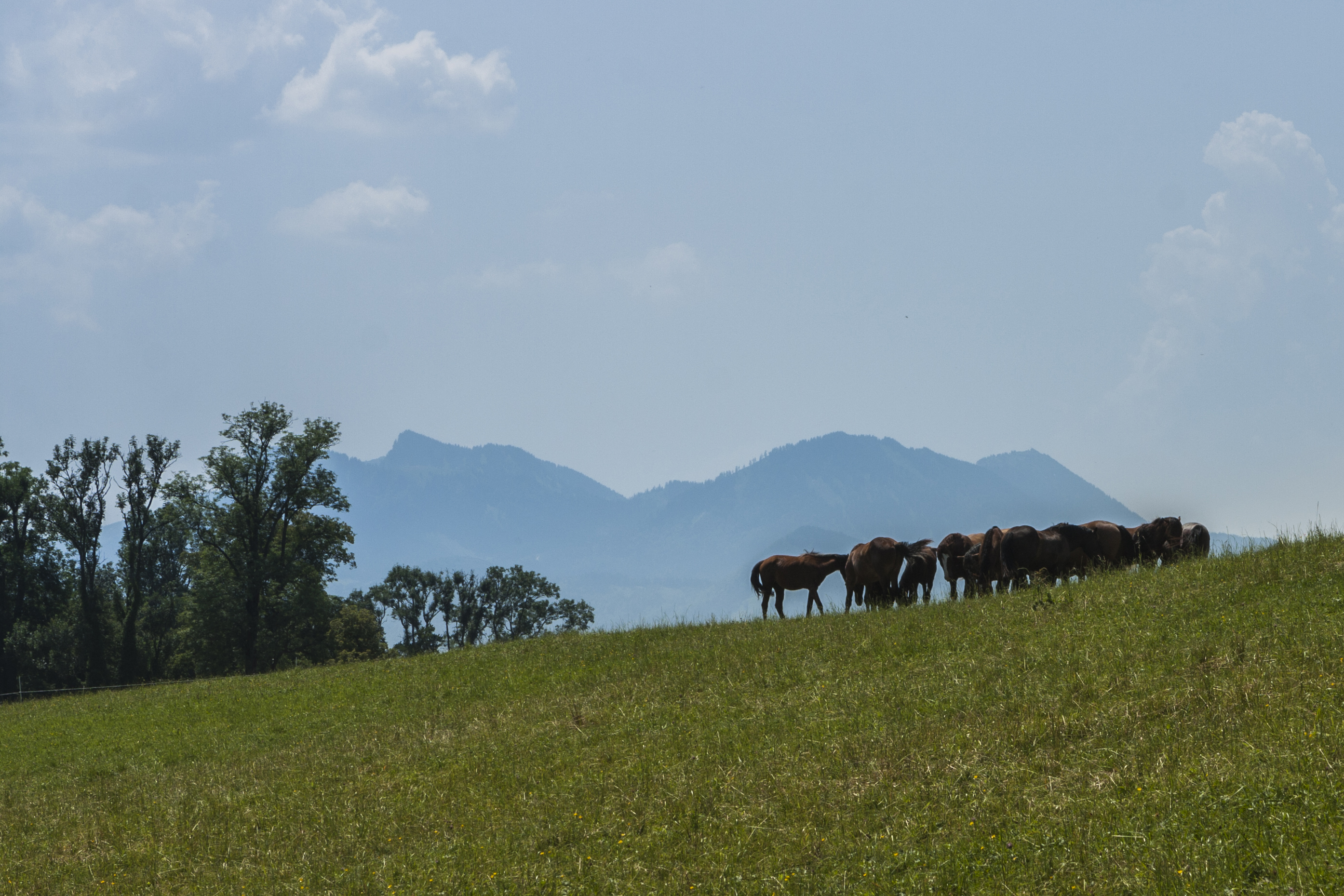 Horses grazing grass on a sunlit green hillslope on a summer day against mountainous backdropKeywords: horse, steed, graze, green, grass, meadow, hill, slope, mountain, mountainous, sunny, sun, hot, summer, afternoon, air, picturesque, scenery, landscape, pasture, landgrass, trees, bushes, blue, sky, clouds, view, brown, field, nature, background, outdoors, mare, rural, countryside