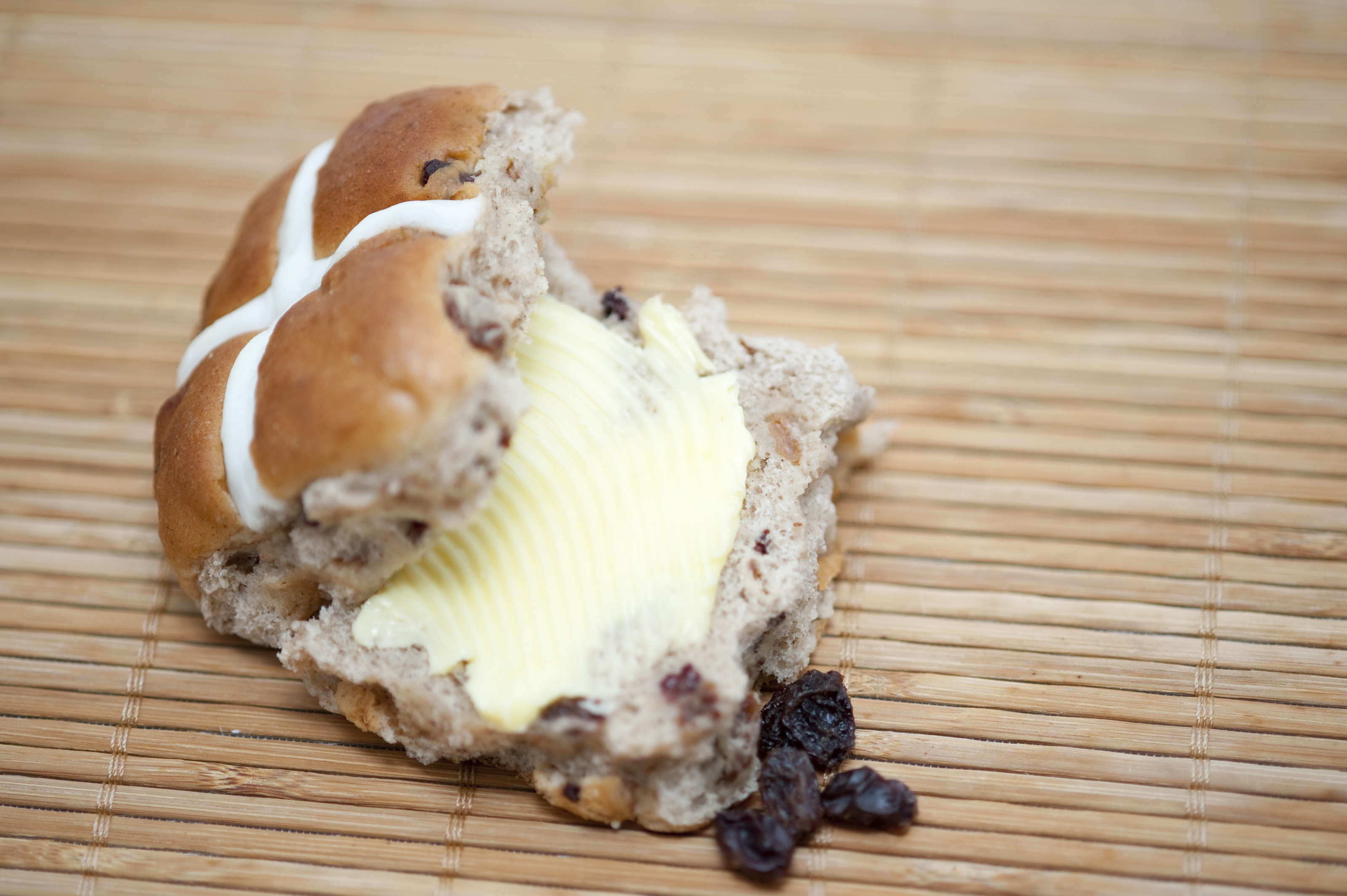 7872 Delicious buttered Hot Cross Bun - this image by easterstockphotos is licensed under a Creative Commons Attribution 3.0 Unported License.