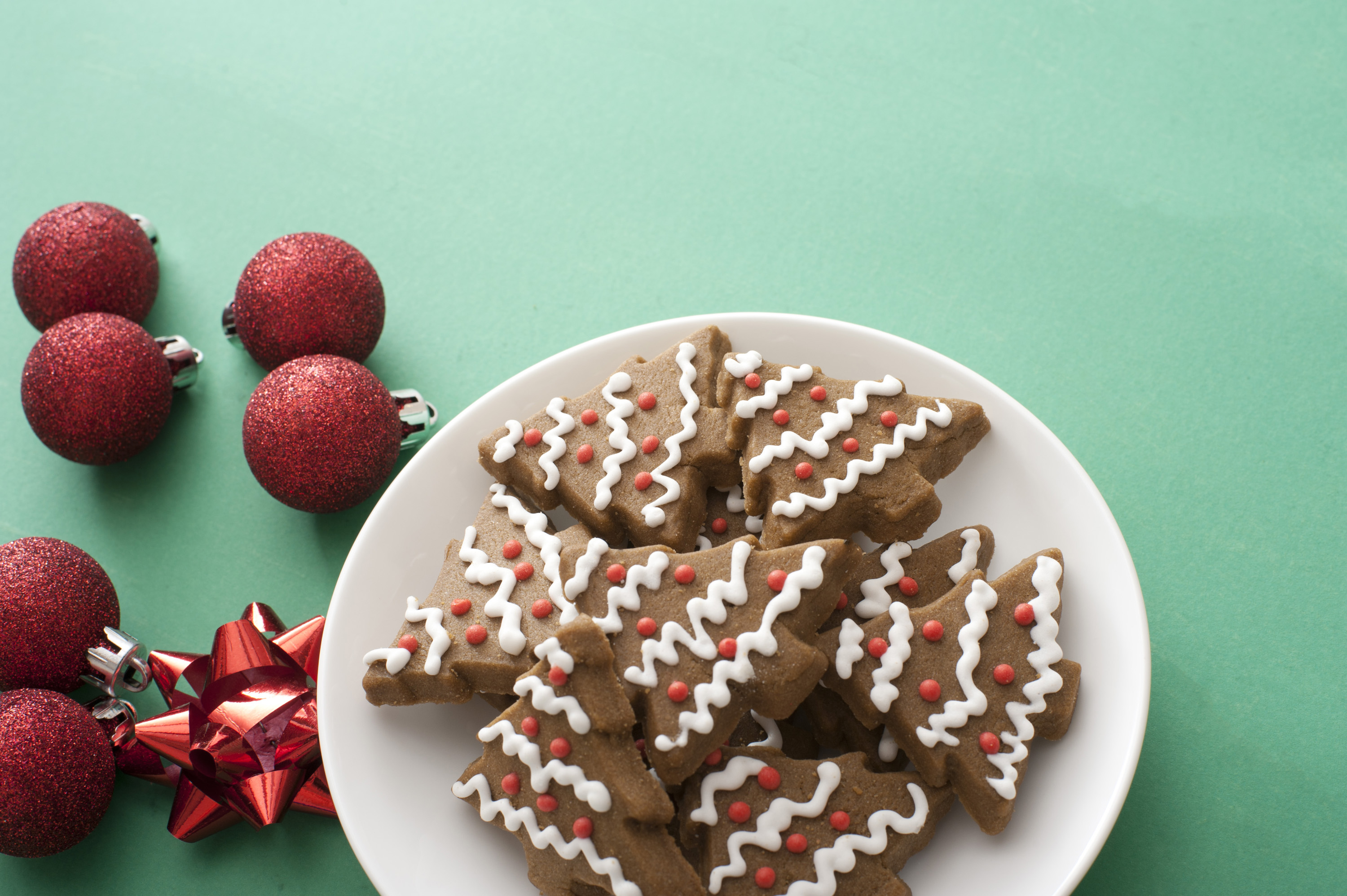 Iced gingerbread Xmas tree cookies served on a plate alongside festive red Christmas baubles and bows on green with copy space for your greeting