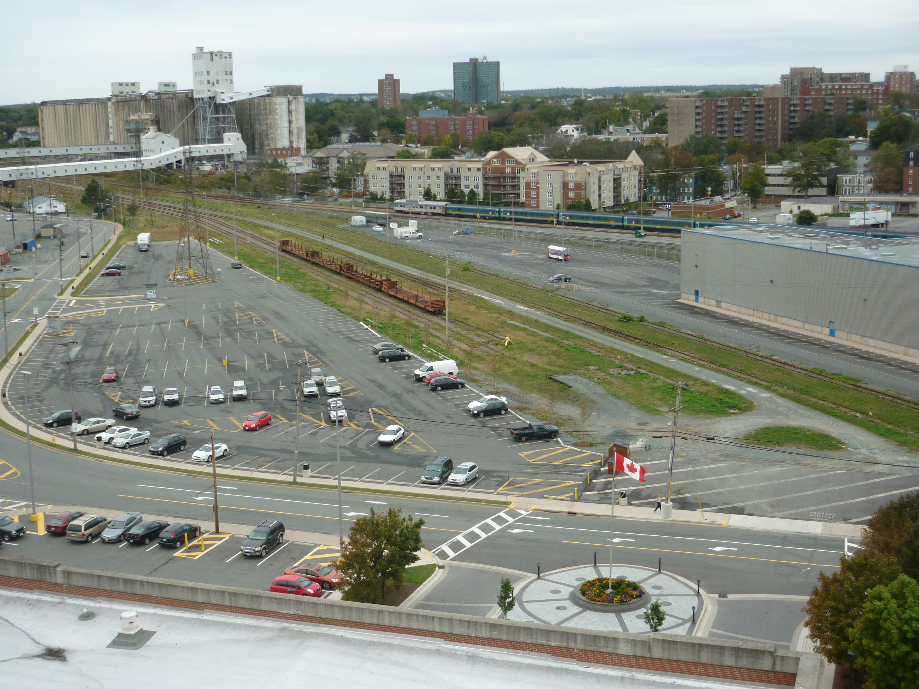 View of the industrial district of Halifax, Canada with a carpark, warehouse and railway siding with highrise buildings in the distance