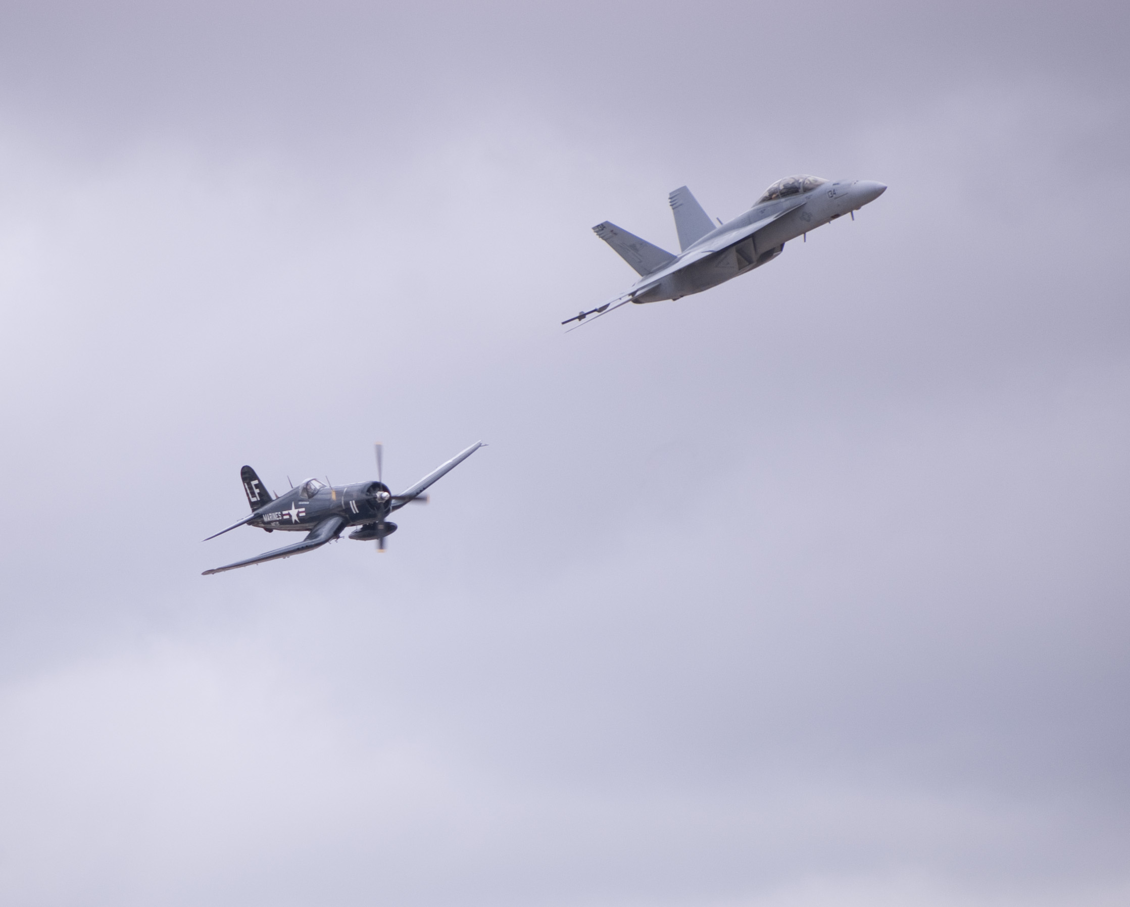 Old versus new, a propeller powered corsair F4U and a jet engined FA18 Hornet