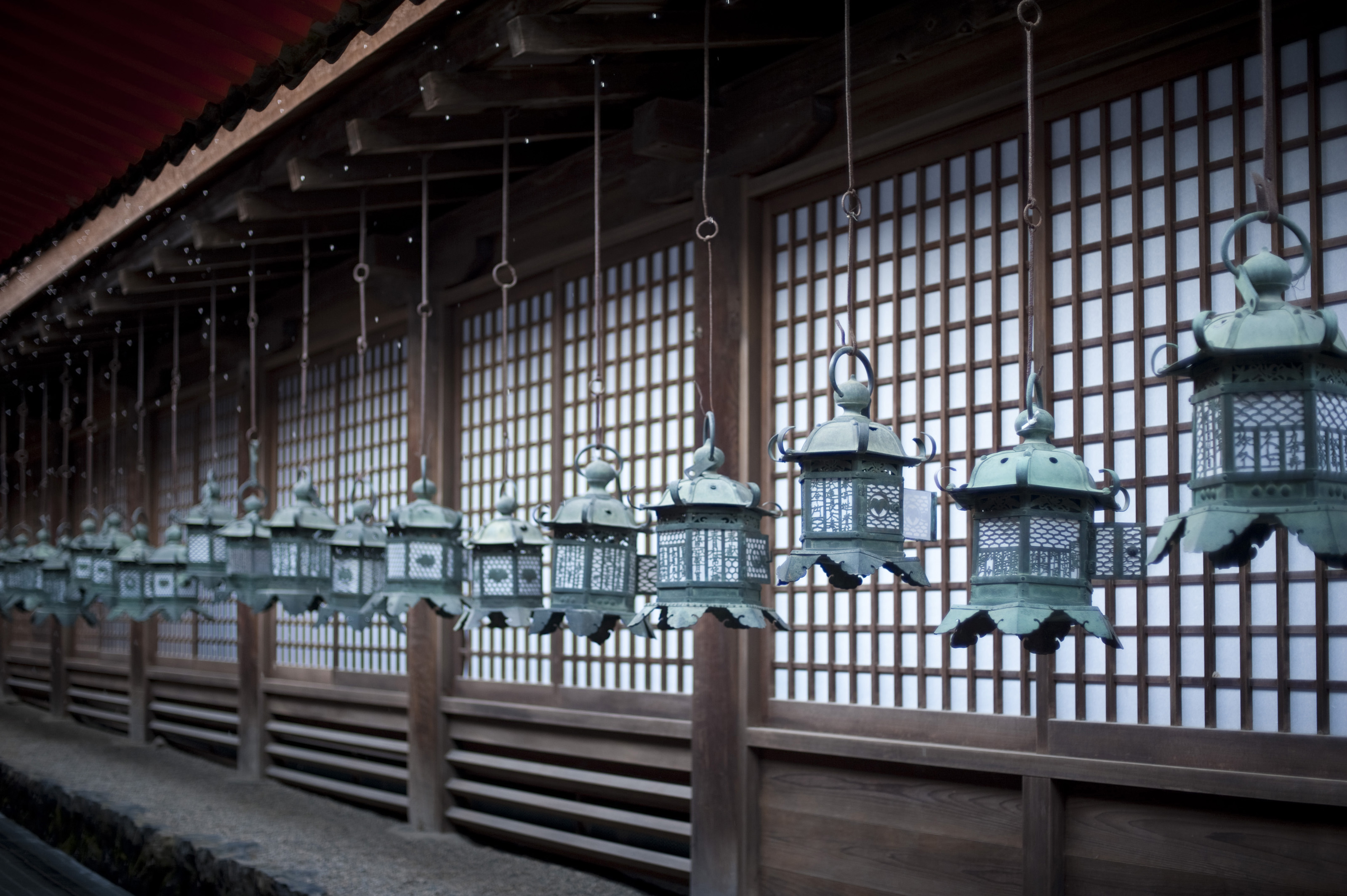 Keywords: roof, line, ornate, hanging, lights, shrine, suspended, brass, lanterns, kondo-doro, metal, shinto, kasuga-taisha, traditional, religious, wall, exterior, walkway, multiple, nara