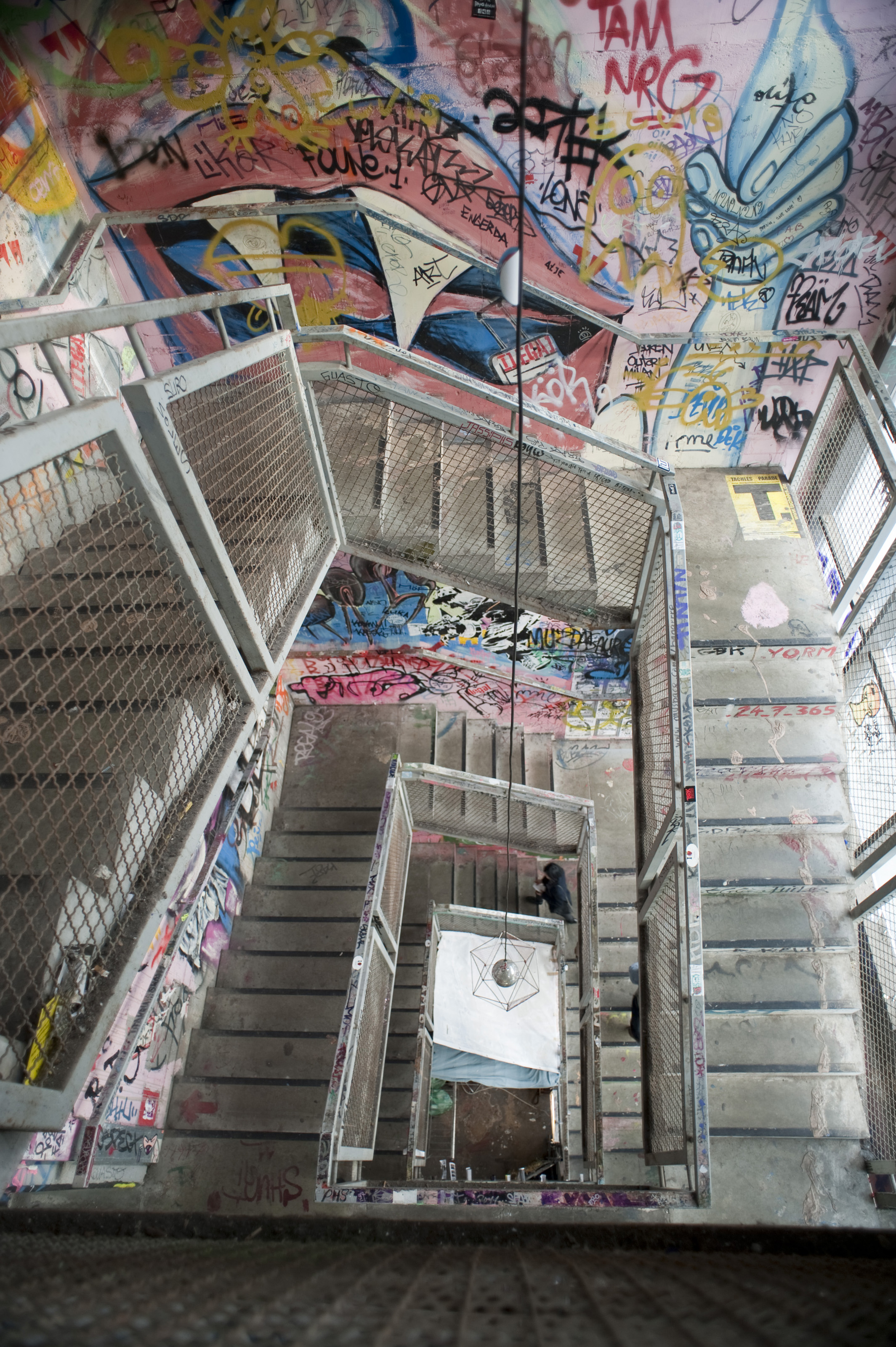 View looking down of an Interior staircase adorned with grafitti at the Kunsthaus Tacheles art squat in Berlin